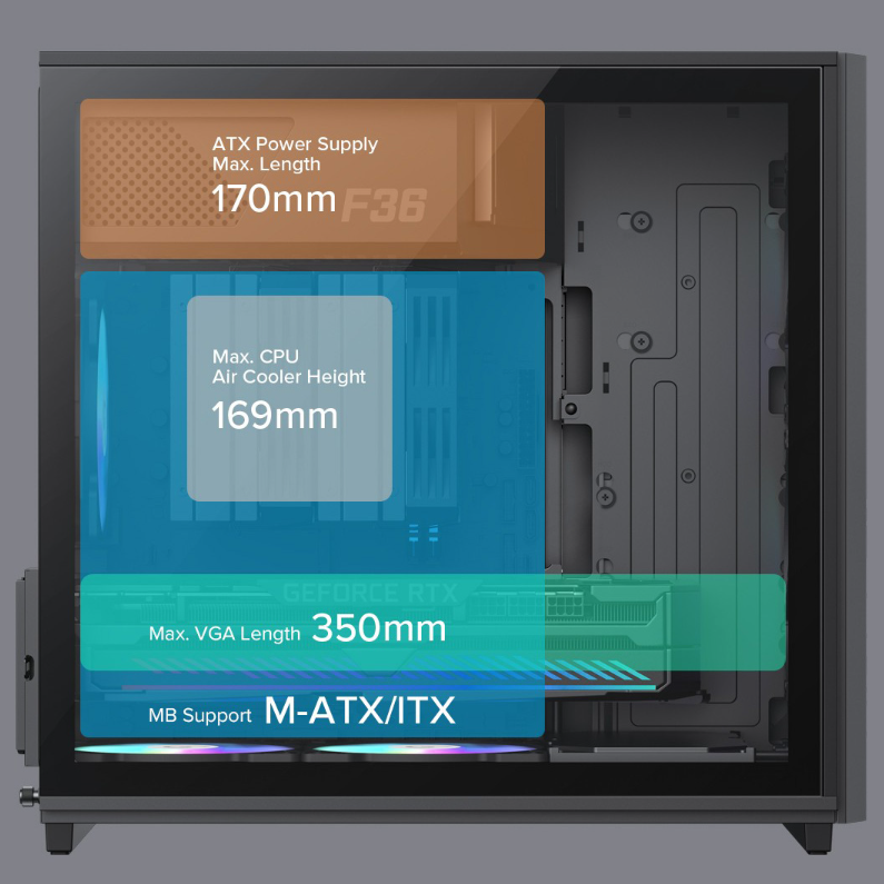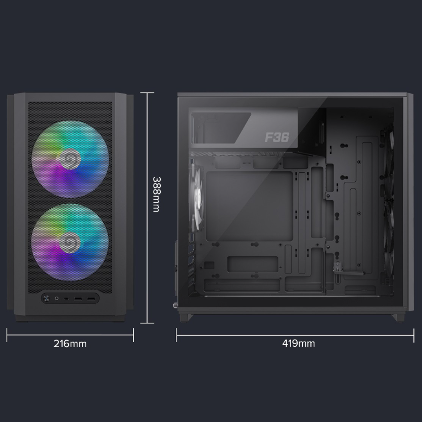 GameMax F36 — компактное решение для сборки систем на базе материнских плат mATX и ITX. При габаритах 419x216x388 мм корпус способен разместить систему жидкостного охлаждения с радиатором до 280 мм и видеокарты длиной до 350 мм. Помимо классических версий без подсветки, доступны модификации с закаленным стеклом и интегрированной RGB-подсветкой. Эстетическую завершенность образу придают два крупных вентилятора с белыми лопастями.