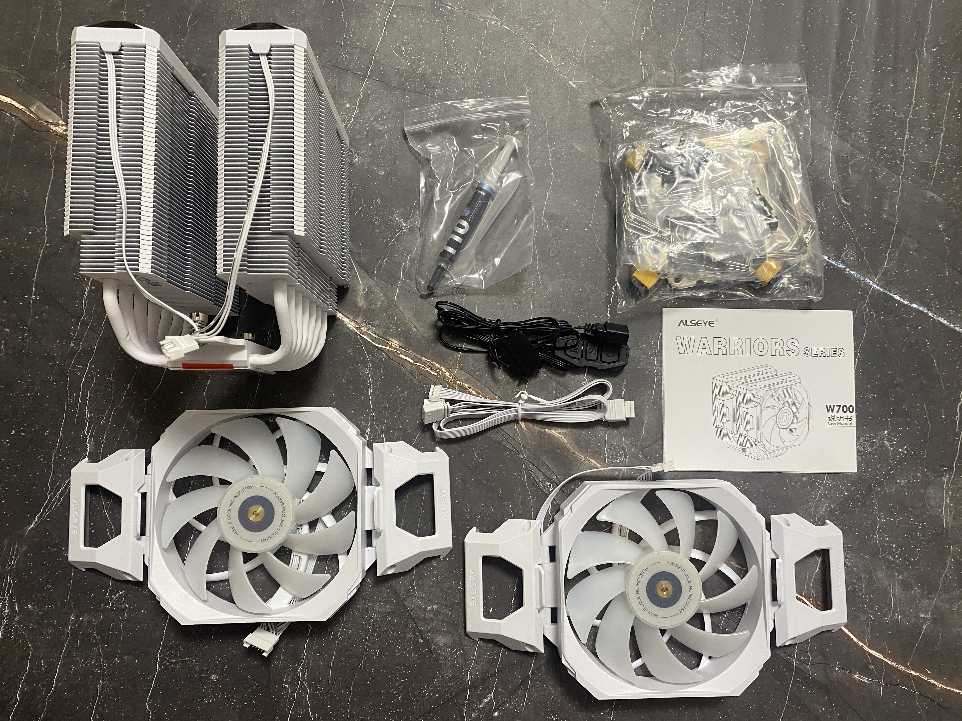 Кулер поставляется в фирменной картонной коробке белого цвета. На лицевой стороне имеется изображение самой модели в том цвете в котором вы приобретаете. На обороте можем увидеть табличку с некоторыми техническими характеристиками. Внутри коробки кулер уложен во вспененный материал, который обезопасит все содержимое во время транспортировки. Хочется заметить, что каждый вентилятор уложен в индивидуальную коробку. Если говорить о комплектации, то в неё входит: Кулер Alseye w700, два вентилятора, крепежный комплект, лопатка и термопаста, разветвительный кабель для вентиляторов, пульт для регулировки оборотов, дополнительные металлические скобы для установки дополнительного вентилятора, руководство по эксплуатации.