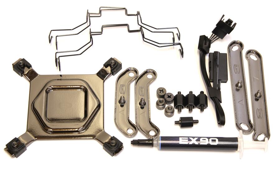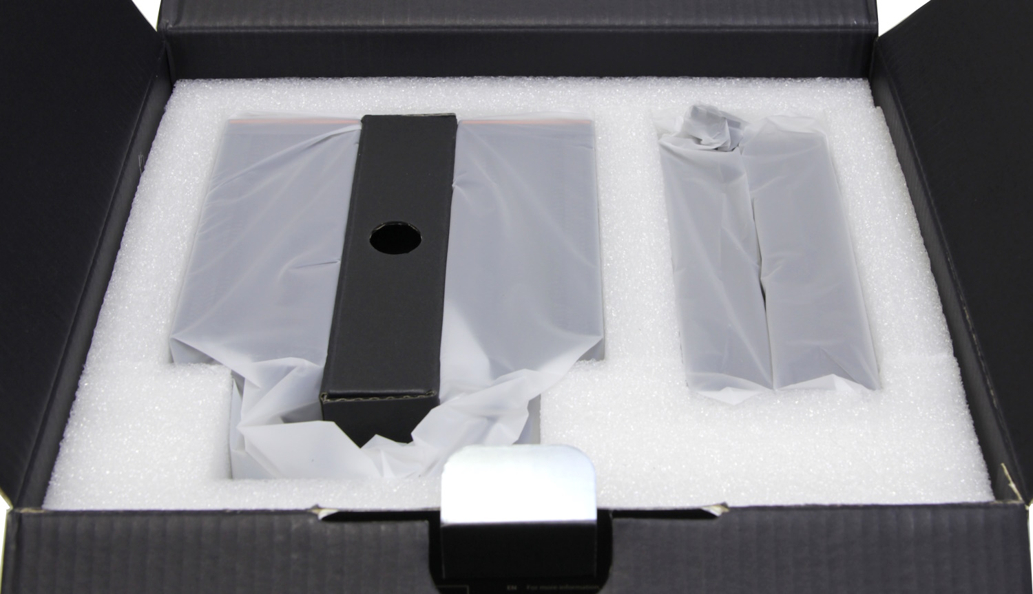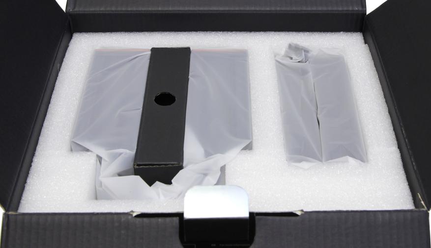 Открыв коробку, можно обнаружить сверху лист из белого пористого материала, который обеспечивает защиту и фиксацию комплекта внутри коробки. Для этих же целей в ней есть специальный каркас из такого же материала, где аккуратно разложены все элементы кулера. Он поставляется в разобранном виде, поэтому радиатор находится отдельно от вентиляторов. Между двумя секциями радиатора расположена картонная коробка с комплектом аксессуаров. Она обеспечивает дополнительную защиту для того, чтобы трубки двух секций не согнулись и радиатор не пострадал. Все элементы дополнительно упакованы в белые пакеты.