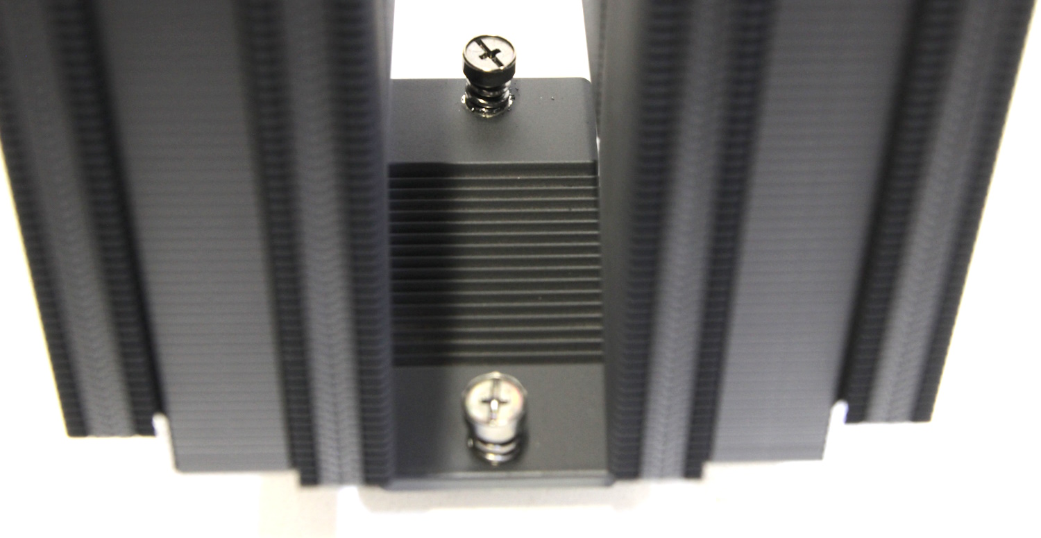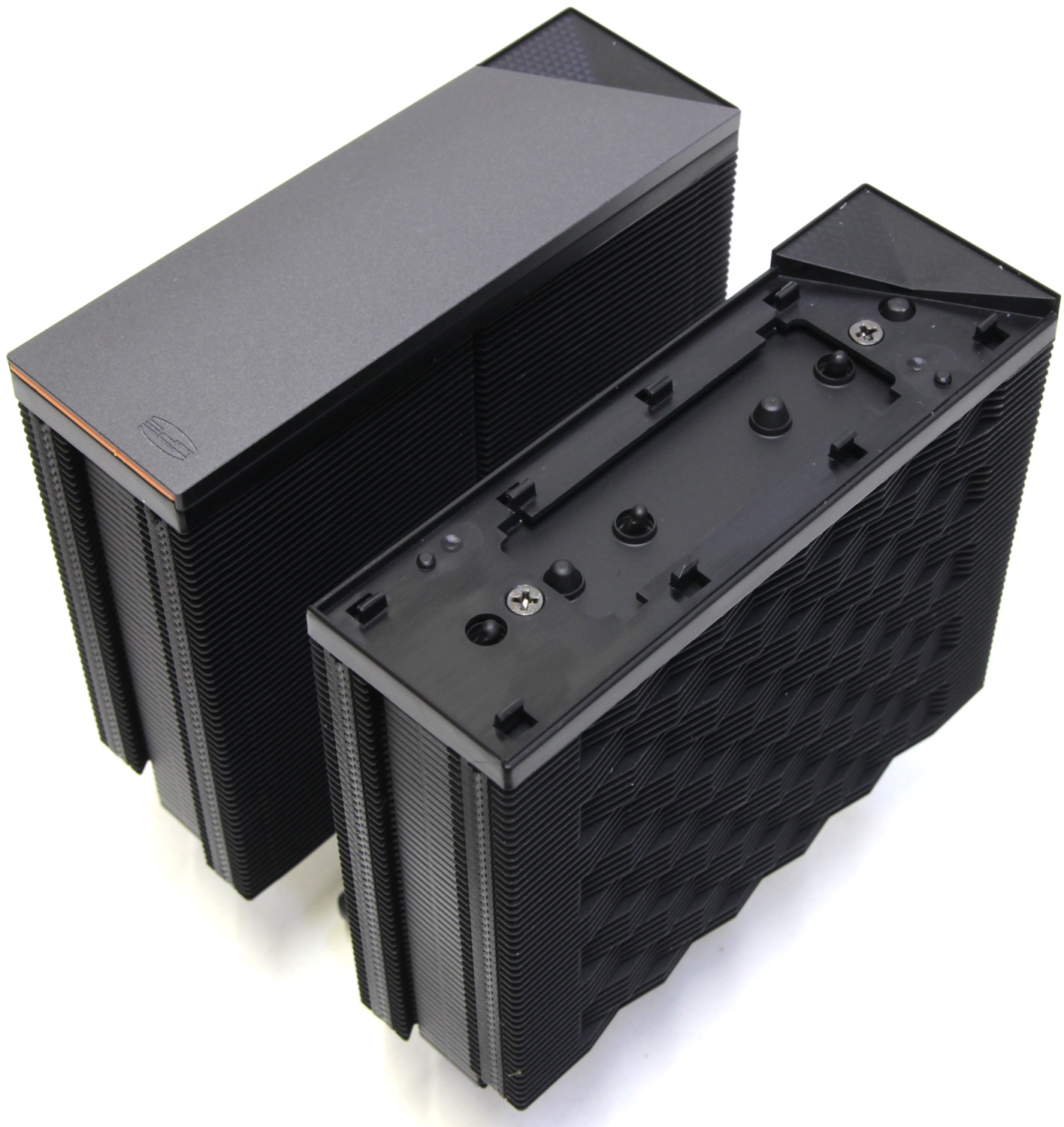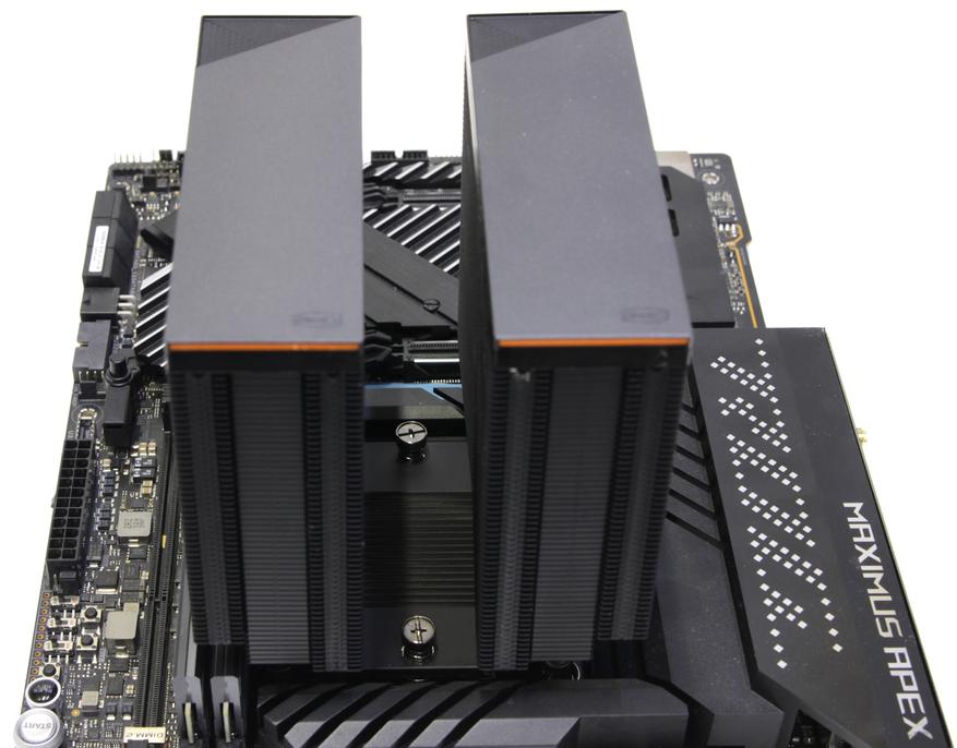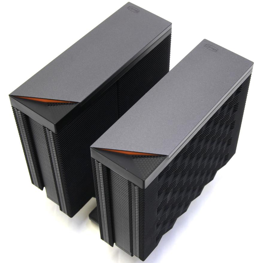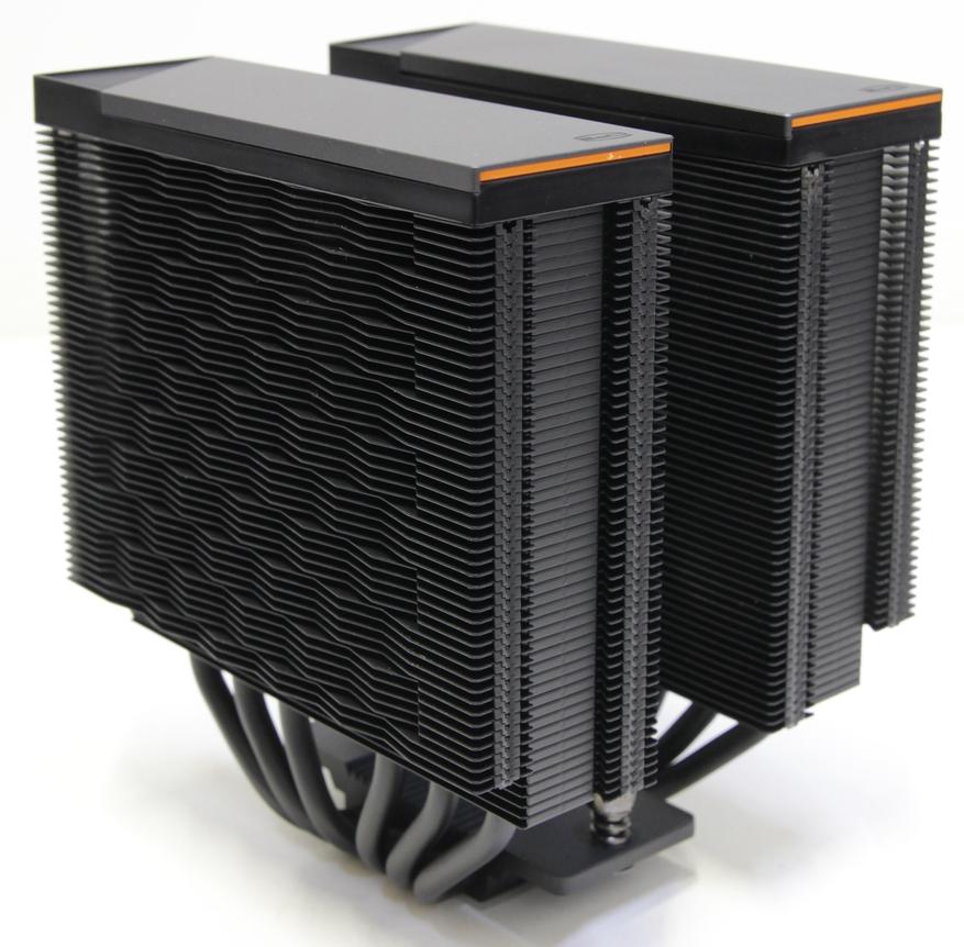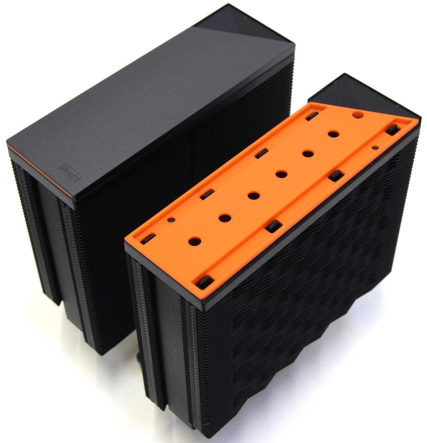 Радиатор получается симметричный относительно основания и поэтому его можно устанавливать любой стороной, если бы не декоративные элементы сверху. Наверху каждой башни находится довольно сложная конструкция. Сверху возвышается металлическая пластина со срезанным углом. Под ней расположена оранжевая вставка и в самом основании чёрная пластиковая панель, которая крепится саморезами к пластинам радиатора. Похожая конструкция у кулера PCCooler RZ400 v2, но там всего одна башня, а тут две одинаковые.