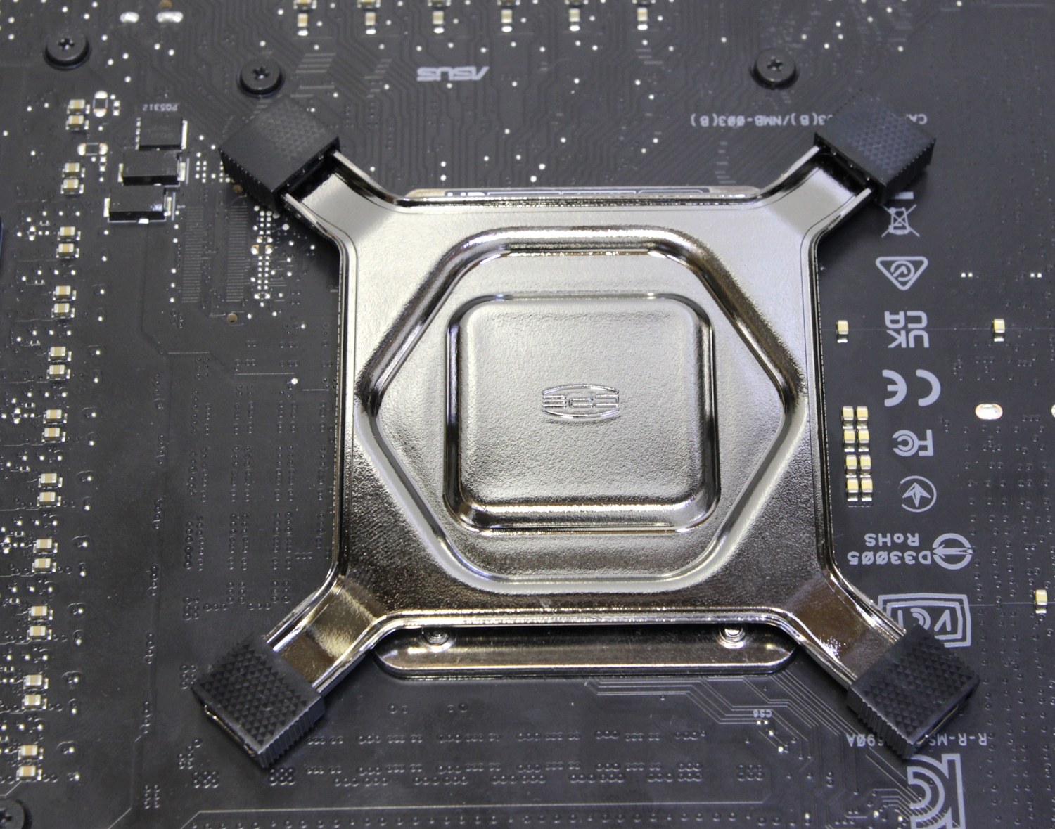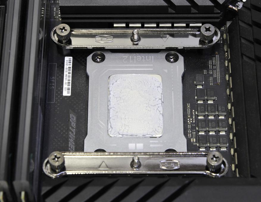 Отпечаток термопасты не идеальный, но прижим по центру отличный. Также я использовал альтернативную рамку для фиксации процессора в сокете.