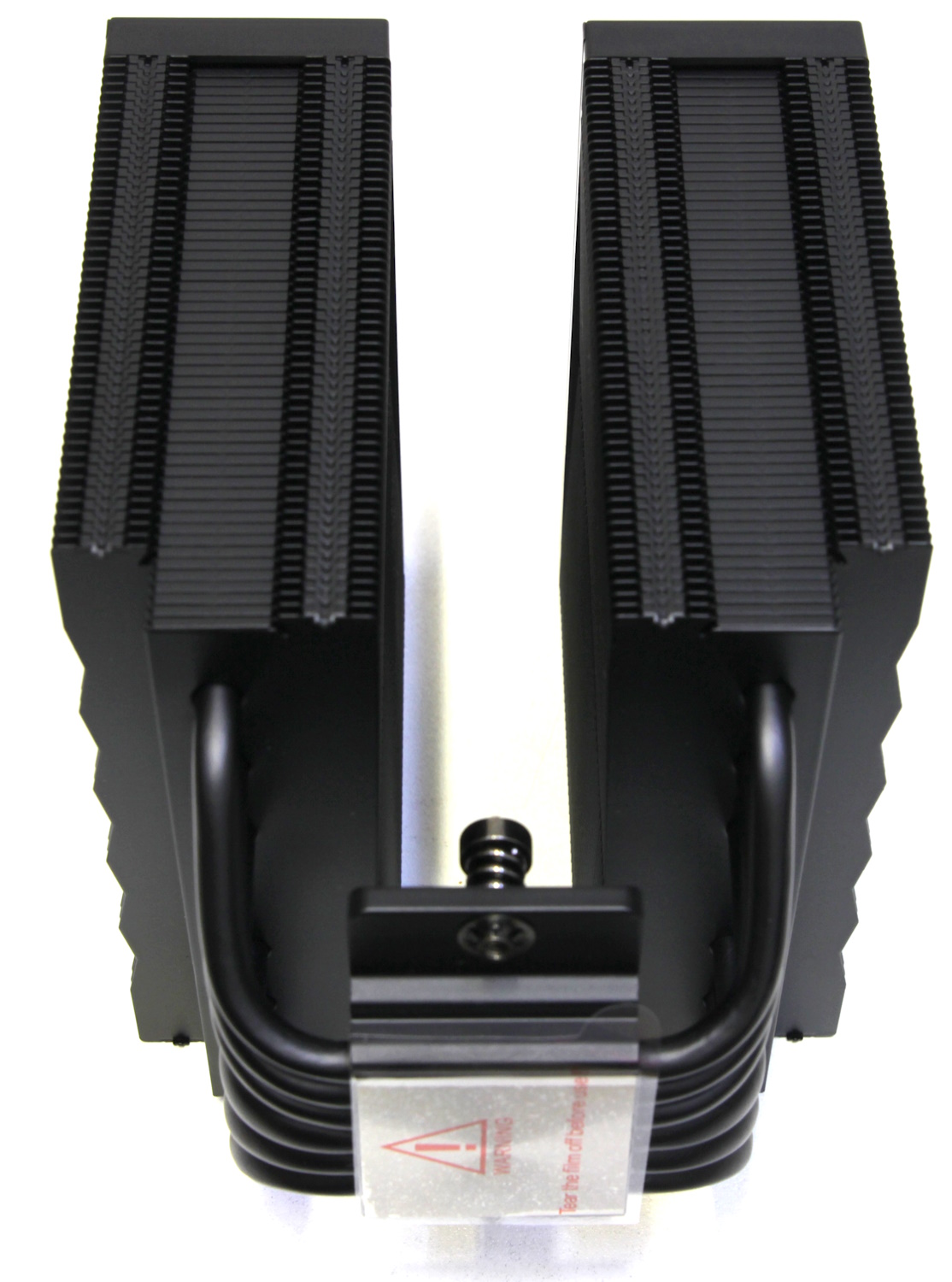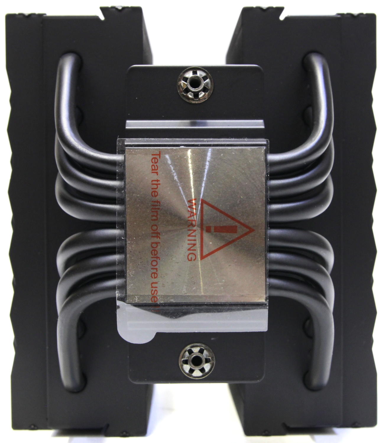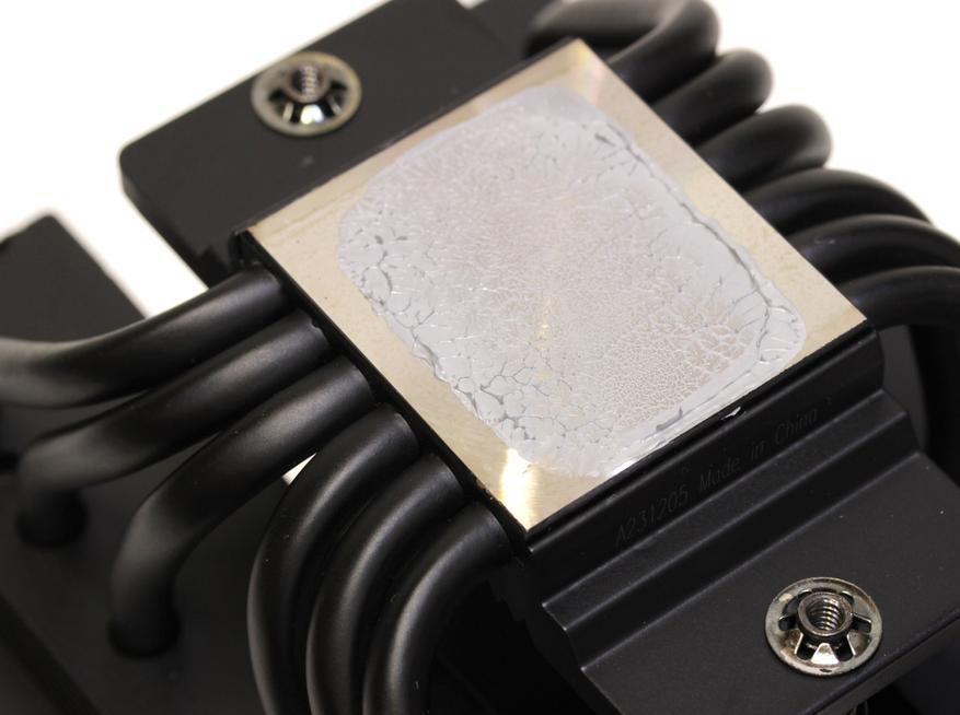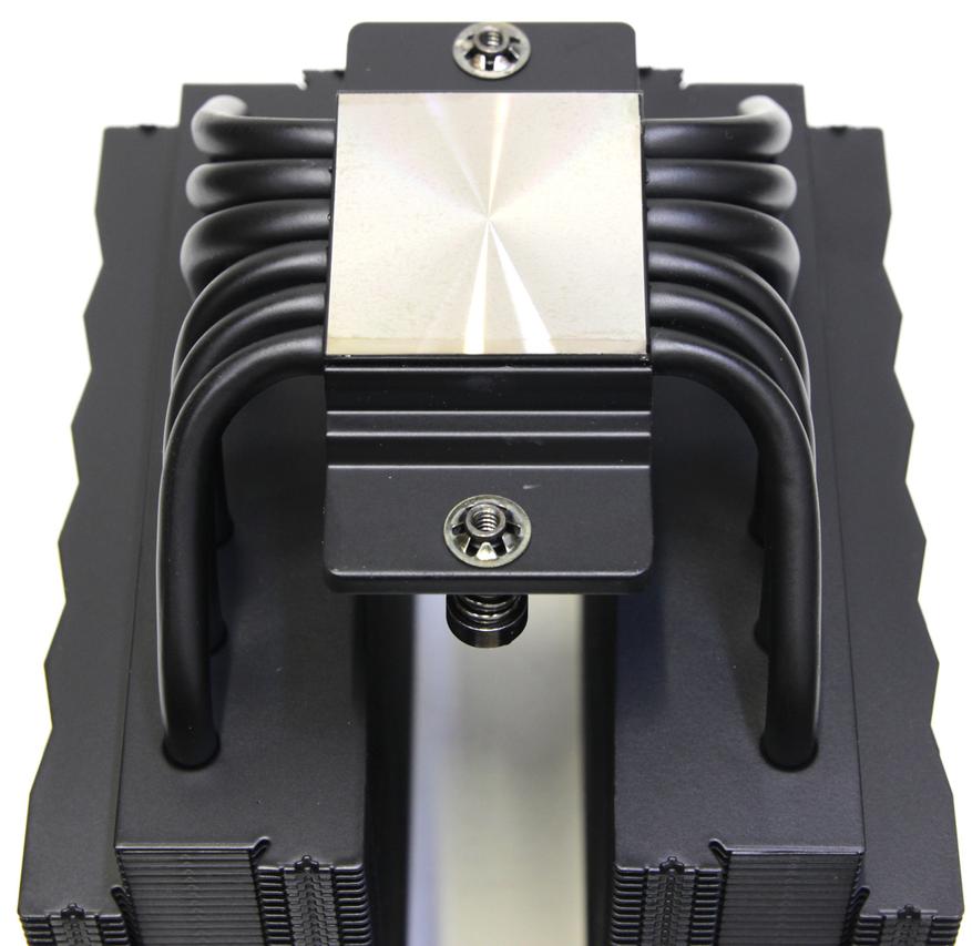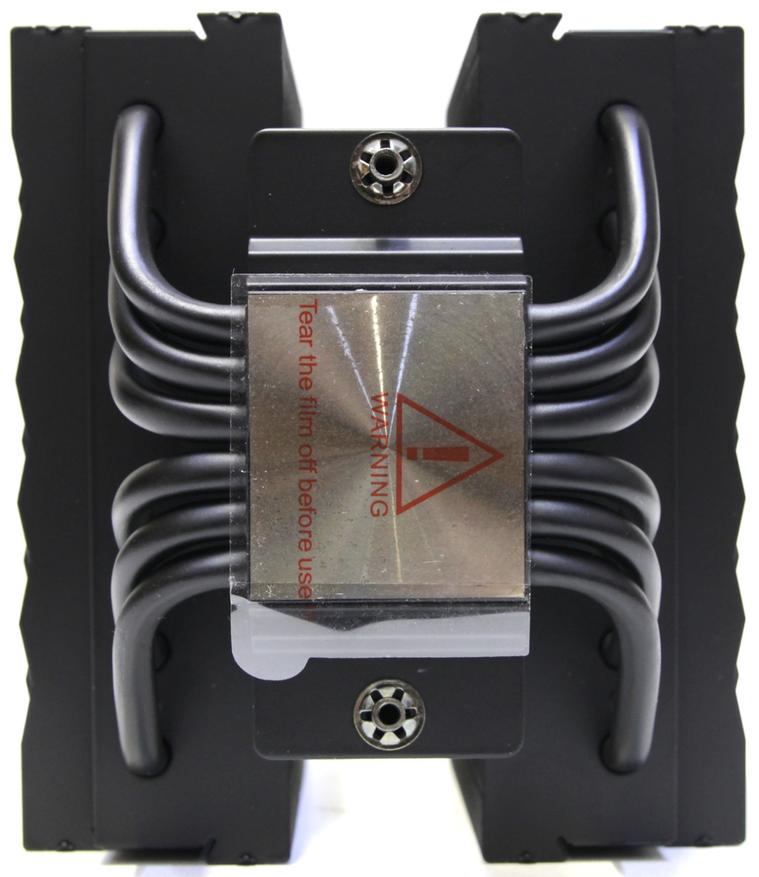 Весь радиатор и трубки окрашены в чёрный цвет, поэтому следов пайки пластин к трубкам не видно. Кроме этого, в основании находится медная никелированная подошва, а сверху небольшой радиатор с перекладиной для крепления, но уже из алюминиевого сплава. Это всё также достаточно распространённые решения. Поверхность контакта с крышкой процессора ровная, но следы от фрезеровки на ней присутствуют. Она закрыта специальной защитной наклейкой, которую необходимо не забыть снять при установке.