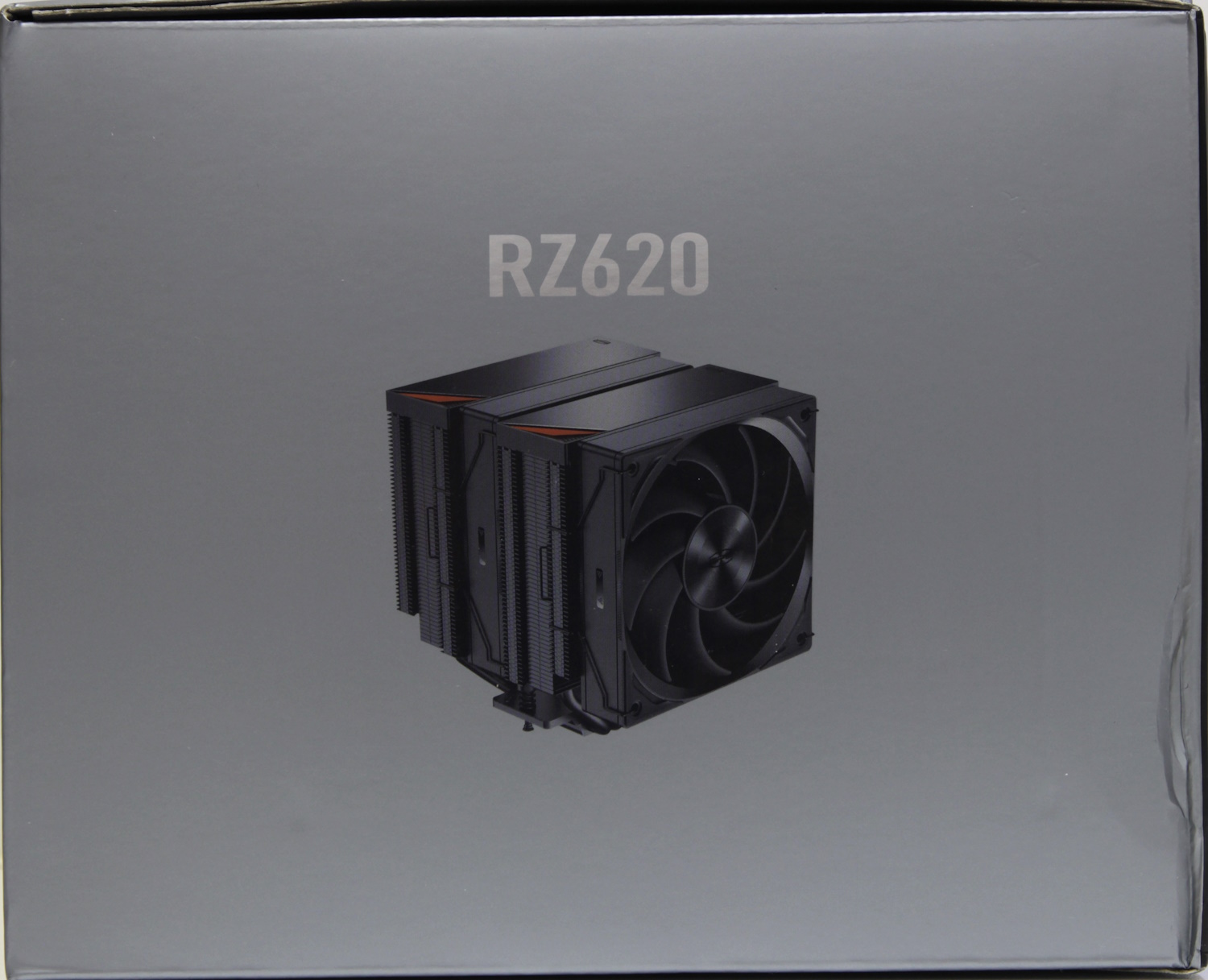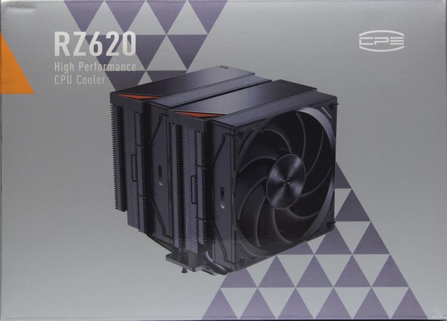 Коробка крупная и тяжёлая. Снаружи мы видим цветную печать. На одной боковине есть изображение кулера. Это классические две башни, соединённые U-образными тепловыми трубками, с двумя вентиляторами и окрашенным в чёрный цвет радиатором. Выглядит он очень симпатично. Здесь же указано название модели и снова какой-то логотип CPS.