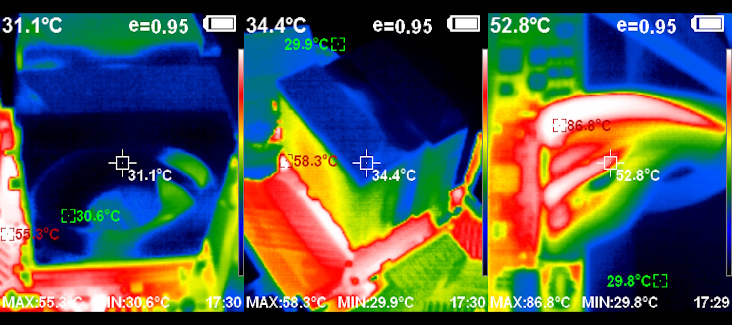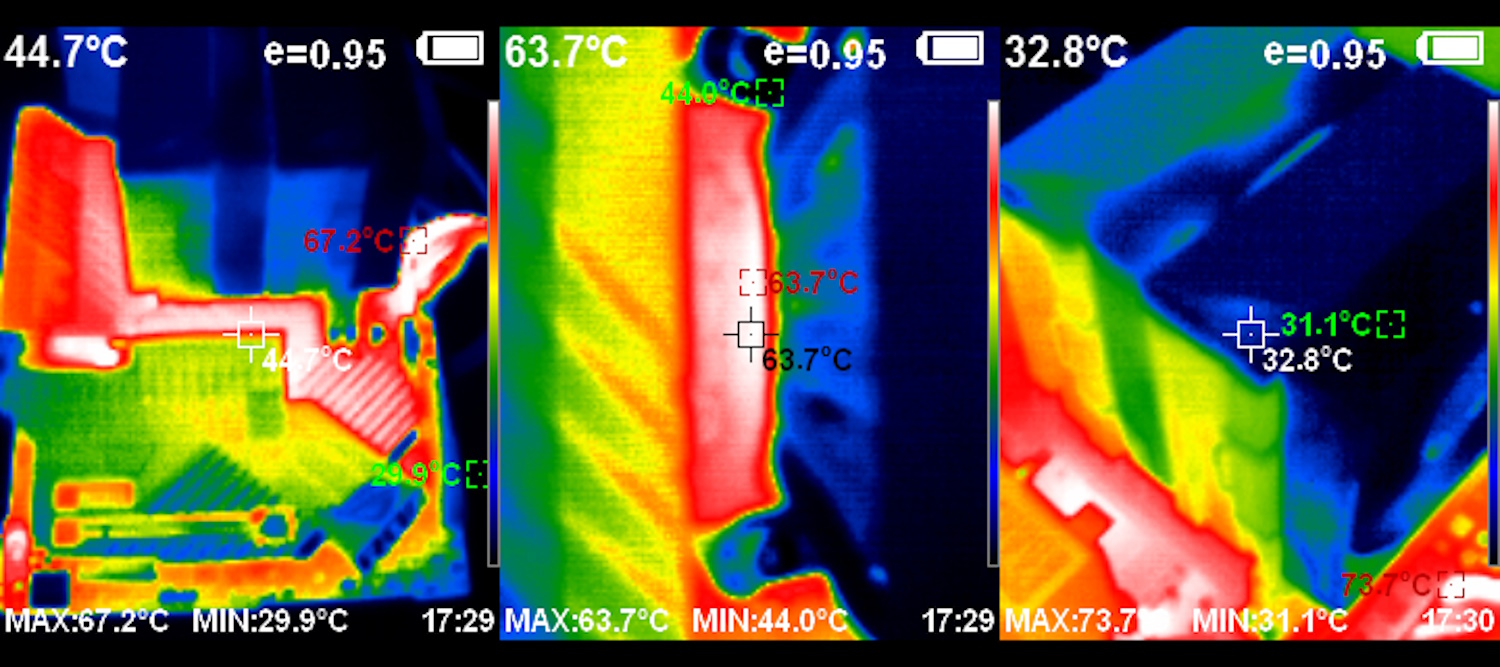 Тепловизор не показывает ничего интересного, кроме того, что коннектор и кабель питания ATX сильно нагреваются в работе.