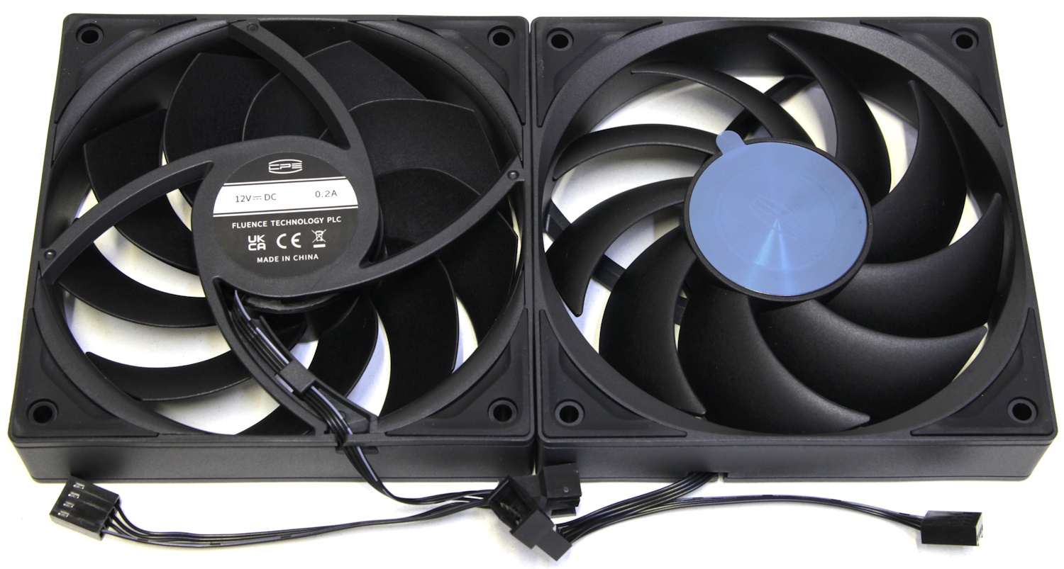 Также в комплекте присутствуют два аналогичных вентилятора. ШИМ управление, девять лопастей, диапазон скорости вращения: 500-2200 об/мин. Максимальный уровень шума также заявлен 32 дБ. Вентиляторы абсолютно аналогичны, о чём свидетельствуют наклейки на двигателях. Характеристики те же: напряжение — 12В, сила тока — 0,2А. По углам также находятся резиновые антивибрационные демпфера. Вентиляторы крепятся специальными стальными скобами, которые поставляются в комплекте.