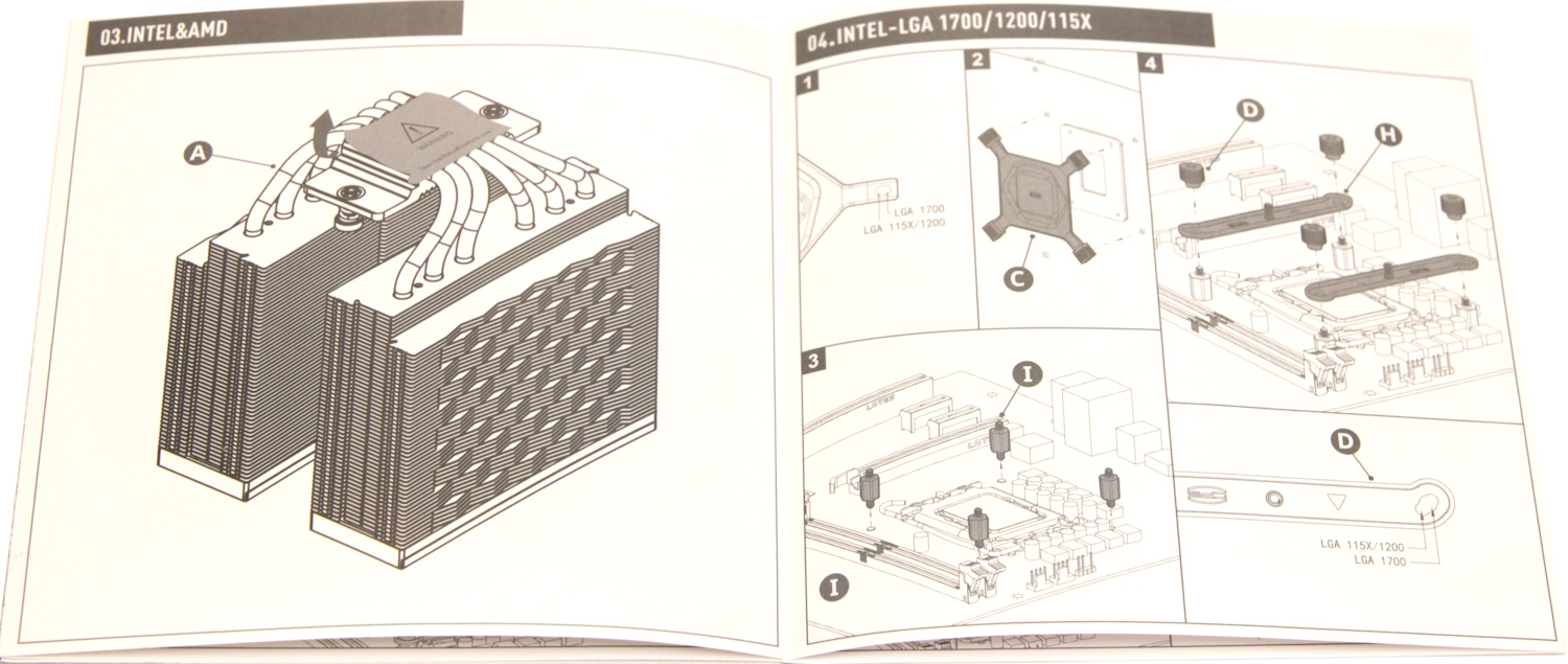 Все основные крепёжные элементы находятся в чёрной картонной коробке, расположенной между двумя секциями радиатора. В комплекте есть всё необходимое. Прежде всего это металлический бэкплейт для платформ Intel LGA 1700/1200/115X, два комплекта металлических скоб для крепления вентиляторов, четыре универсальные втулки-адаптера, которые подходят для штатной резьбы крепёжной пластины AMD AM4, AM5, четыре гайки для них, два комплекта перекладин (один для Intel, другой для AMD), переключатель режимов работы вентиляторов, шприц с термопастой. Также есть инструкция по установке кулера на разные платформы. Совместимые платформы перечислены в спецификации. Здесь представлены наиболее популярные от Intel и AMD.