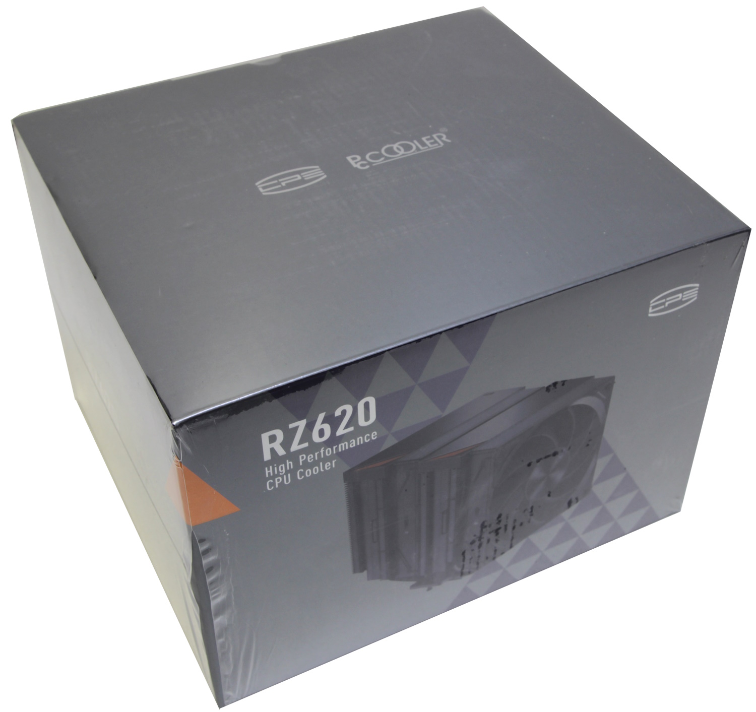Я уже замечал, что у компании PCCooler свой стиль в оформлении. Это выражено в сером фоне, оранжевых вставках и использовании треугольников. Снаружи картонная коробка снова затянута в прозрачную плёнку. На это раз мне даже повезло, и она оказалась не мятая.