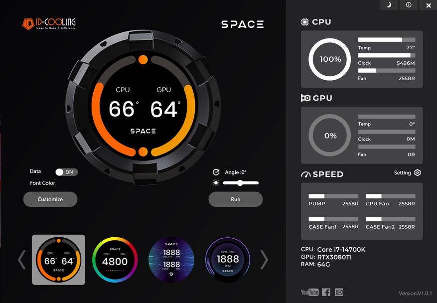 ID-COOLING SL360 XE поддерживает управление RGB-подсветкой при помощи программы ID-COOLING Space, это позволяет пользователям легко настроить световые эффекты по своему вкусу и синхронизировать подсветку с остальными компонентами системы. Программное обеспечение позволяет отображать информацию о вашей системе на экране. Поддерживается несколько вариантов дизайна виджетов, которые можно выбирать и настраивать. Вы можете регулировать яркость, угол поворота изображения и выбрать, какие датчики отображать. Также есть возможность включить автозагрузку настроек при запуске Windows.
