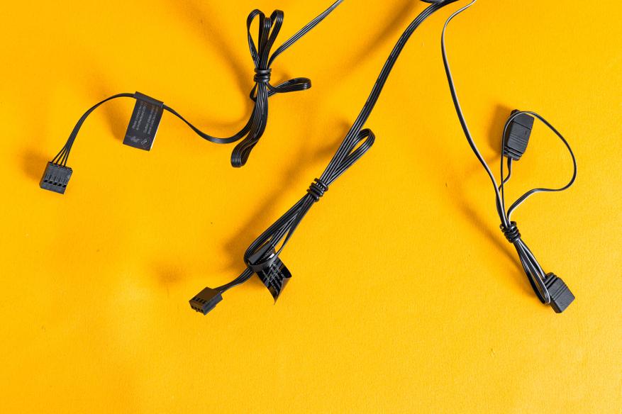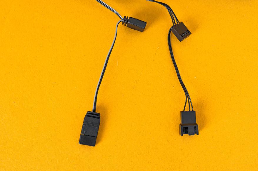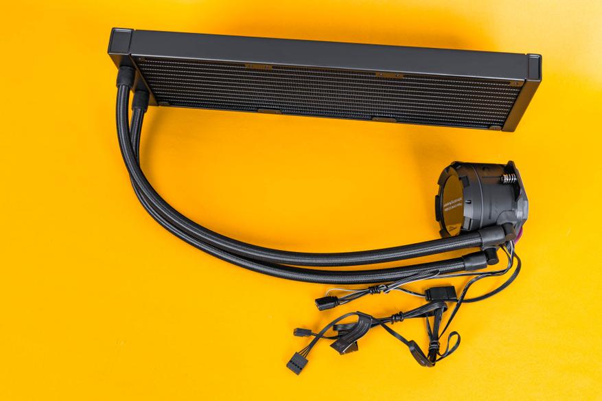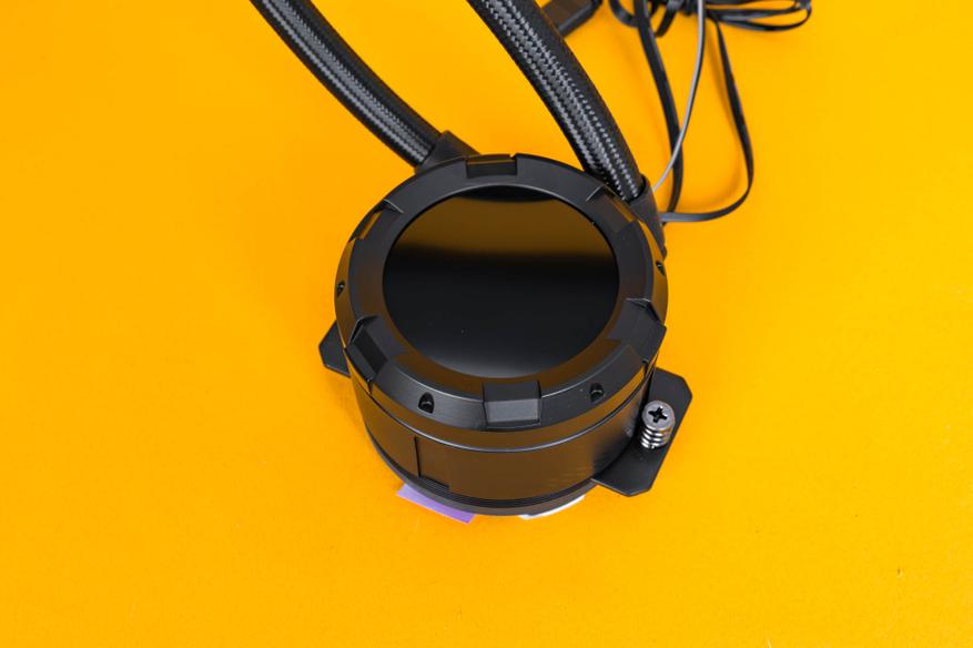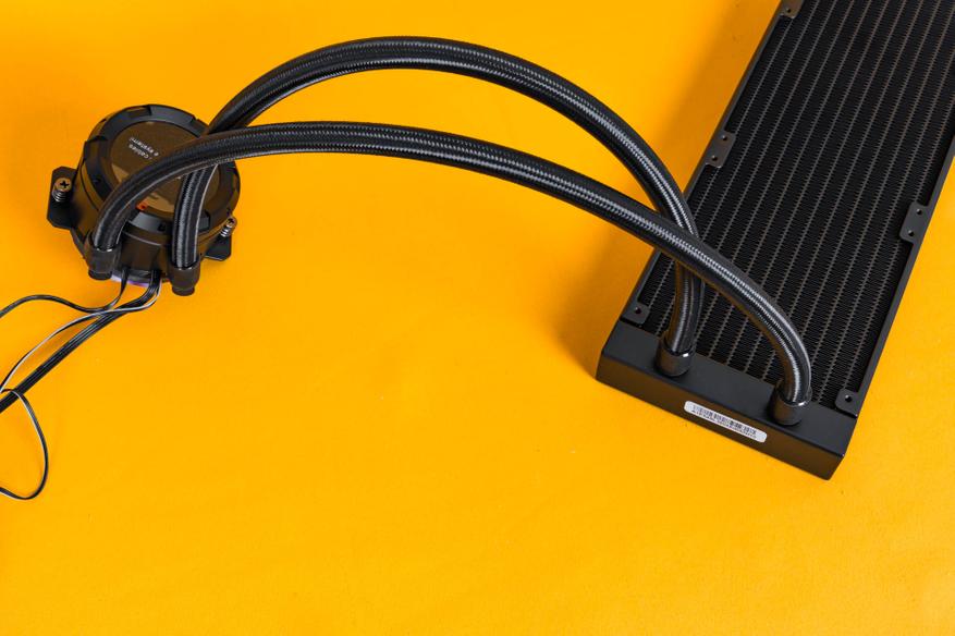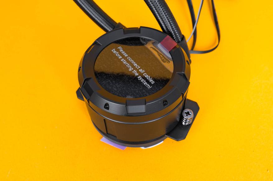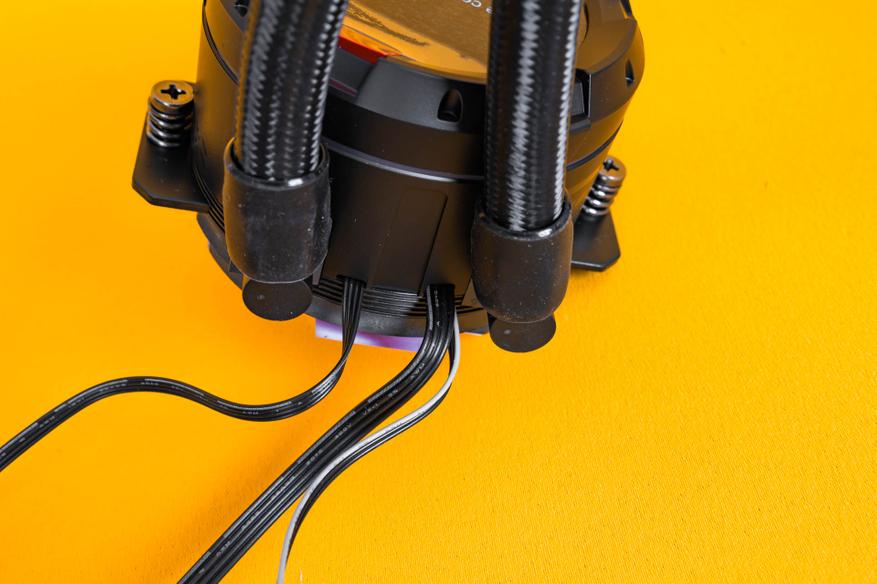 Водоблок с помпой соединяются со шлангами с помощью Г-образных фитингов. Между Г-образных фитингов можно заметить три провода: один для подключения подсветки, второй — от помпы для подключения к FAN-разъёму на материнской плате, и третий — для подключения к USB-разъёму, что обеспечивает работу экрана.
