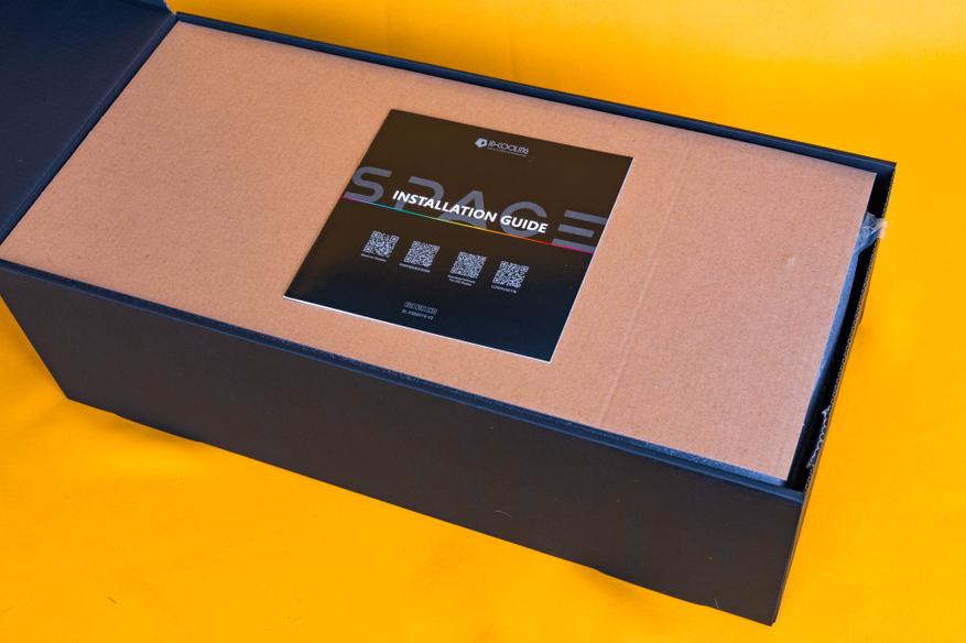 Дизайн упаковки выполнен в минималистичном стиле с использованием фирменных цветов компании — чёрного и оранжевого. На лицевой стороне упаковки можно увидеть цветное изображение AIO СЖО ID-COOLING SL360 XE, а также на английском языке перечислены ключевые особенности данной модели. На тыльной стороне представлена таблица с техническими характеристиками, схематичное изображение SL360 XE с указанием габаритов.