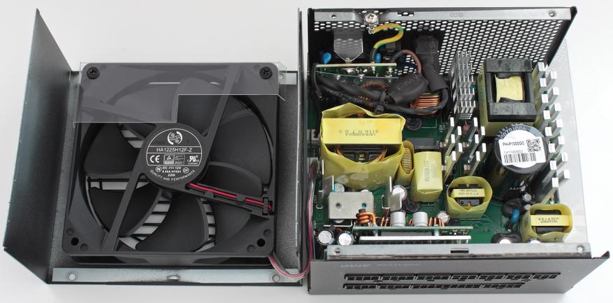 Нагретый воздух покидает пределы блока при помощи нагнетающего вентилятора Hong Hua HA1225H12F-Z на тихом и надёжном гидродинамическом подшипнике.