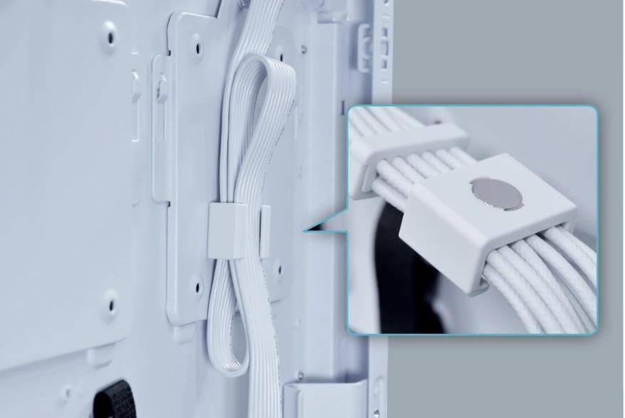 В комплект входят кабели 12V-2x6 с двухцветными разъёмами, оплётка 24-пинового провода снабжена гребнем для удобства фиксации, а для плоских кабелей EPS и PCIe предусмотрены магнитные клипсы.