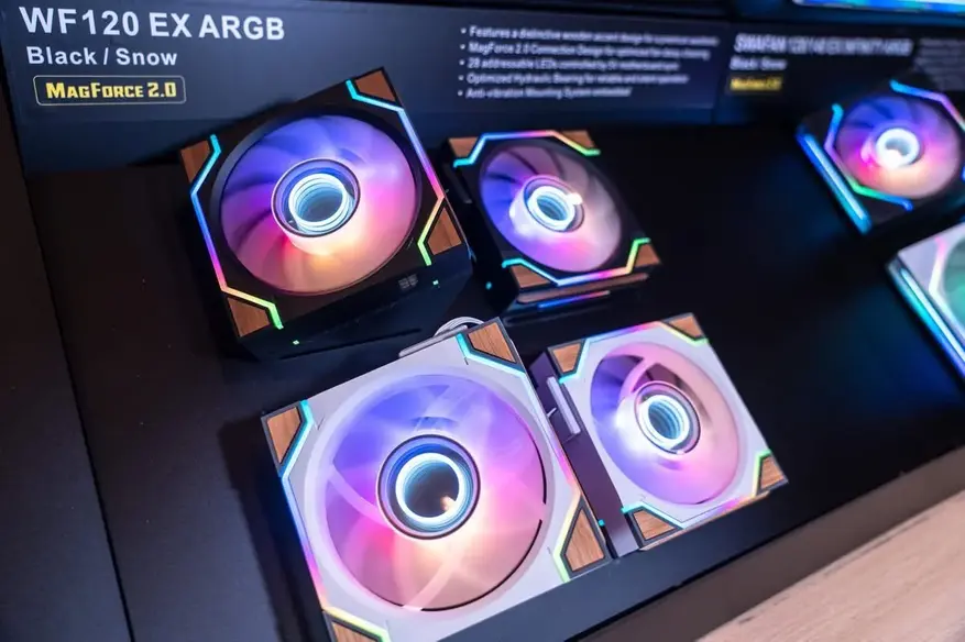 Настоящей экзотикой в линейке стали вентиляторы WF120 EX ARGB, в оформлении которых используется натуральное дерево. Деревянные акценты на рамке и прокладках призваны придать сборке «теплоту» и премиальный тактильный уровень. Как и другие новинки серии, эти вентиляторы поддерживают быструю магнитную стыковку без лишних проводов и оснащены специальными накладками, скрывающими крепежные винты.