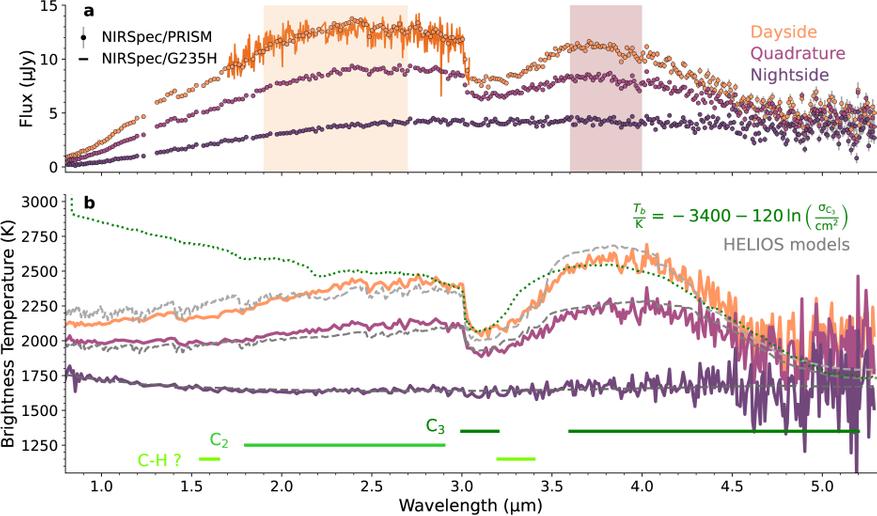 Однако когда команда астрофизиков направила на планету зеркала «Джеймса Уэбба» и проанализировала ее спектр, они увидели нечто невероятное. Вместо ожидаемой смеси кислорода, азота и других элементов, атмосфера оказалась перенасыщена молекулярным углеродом (C2 и C3). Соотношение углерода к кислороду там превышает 100, а к азоту — 10 000. Это мир, где в атмосфере практически нет ничего, кроме сажи и графита.