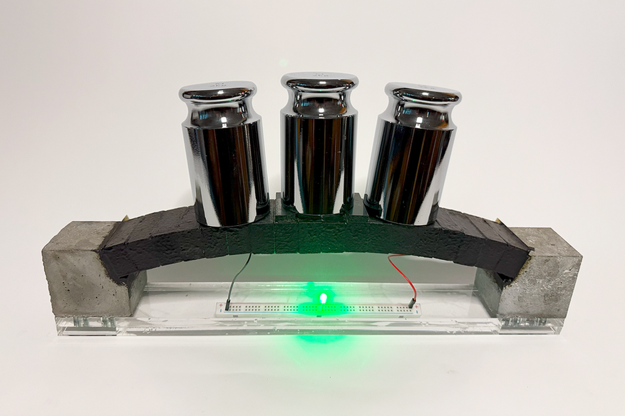 Кроме того, исследователи установили, что морская вода может служить эффективным электролитом, что открывает перспективы для использования технологии в морских сооружениях, например, в фундаментах ветряных турбин. Была также продемонстрирована возможность мониторинга состояния конструкций: созданная из материала 9-вольтовая арка, подключенная к светодиоду, вызывала его мигание при приложении физической нагрузки, сигнализируя о деформации.
