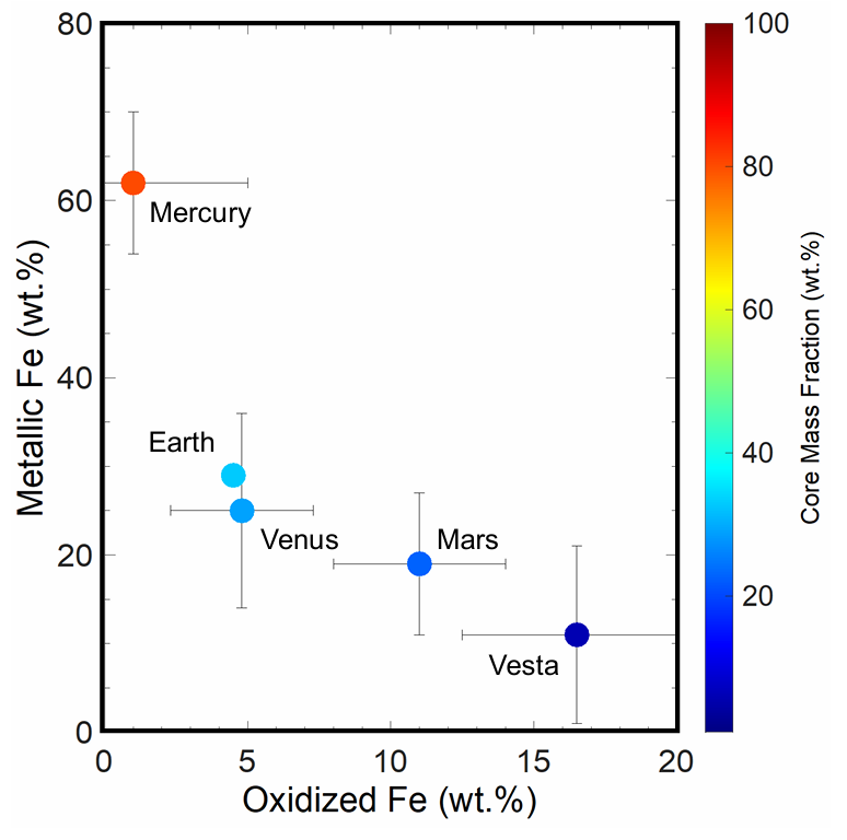 - Высокая фугитивность: кислорода много. Он активно окисляет железо. Окисленное железо (FeO) остается в мантии планеты, входя в состав силикатных пород. В результате ядро планеты получается маленьким, так как свободного металла остается мало.