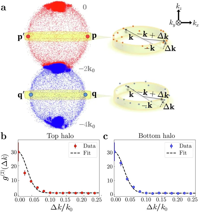По мере того как эти группы пространственно разделяются, атомы на их границах сталкиваются друг с другом. Происходит процесс, известный в квантовой механике как s-волновое рассеяние. Согласно закону сохранения импульса, если пара атомов сталкивается, они обязаны разлететься в строго противоположных направлениях. В результате в вакуумной камере формируется расширяющаяся сфера (гало) из разлетающихся частиц.