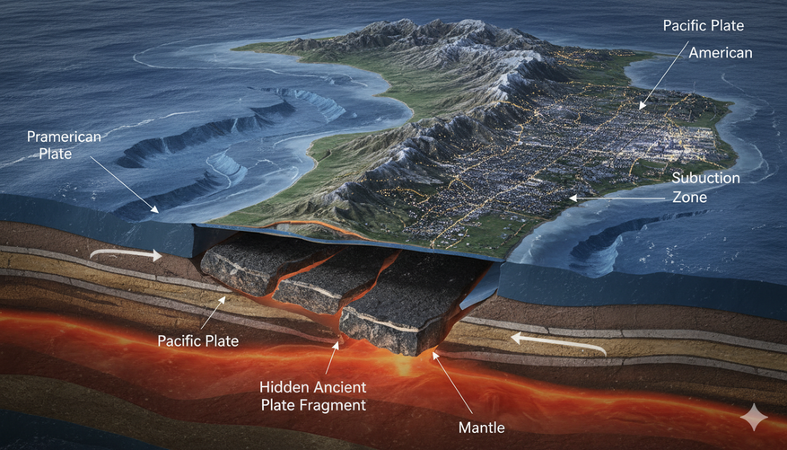 Фрагмент древней океанической коры, который, как считалось ранее, полностью погрузился в мантию Земли, на самом деле «прилип» к основанию Тихоокеанской плиты и дрейфует вместе с ней. Об этом говорится в новом исследовании, опубликованном в четверг, 15 января 2026 года, в журнале Science. Неожиданное открытие, сделанное группой сейсмологов под руководством Геологической службы США, фундаментально меняет понимание тектонических процессов в зоне тройного сочленения Мендосино у побережья Северной Калифорнии.
