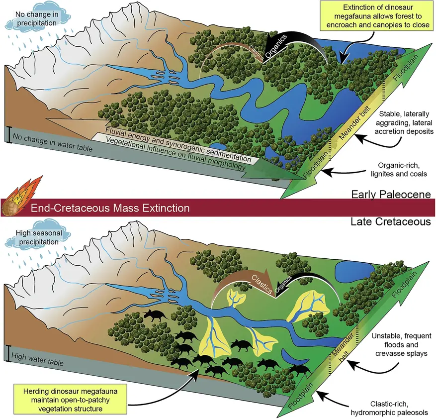 Исчезновение динозавров вызвало цепную реакцию. Реки изменили свой характер. Это, в свою очередь, создало новые экологические ниши. Например, появление густых лесов способствовало эволюции древесных млекопитающих, включая наших далеких предков — ранних приматов.