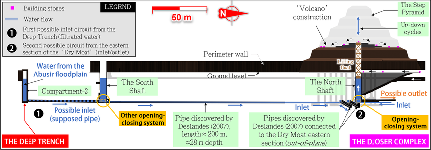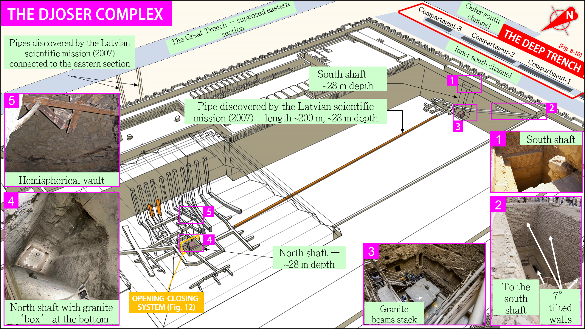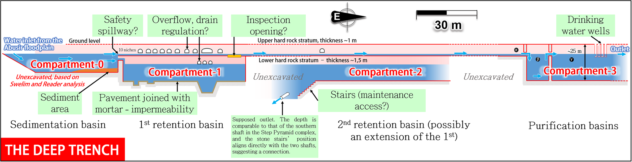 В связи с этим, особого внимания заслуживает «Сухой ров» — широкий ров, окружающий пирамиду Джосера. Внутри этого рва расположен высеченный в скале канал, известный как «Глубокая траншея». Ранее считалось, что «Глубокая траншея» служила карьером для добычи камня, однако, эта версия вызывает сомнения в свете новых исследований. Ученые обнаружили, что «Глубокая траншея» состоит из нескольких отсеков, соединенных туннелем. Расположение, размеры и геометрическая точность этих отсеков свидетельствуют о том, что они использовались для очистки воды. Вероятно, «Сухой ров» в сочетании с «Глубокой траншеей» представлял собой сложную систему водоочистки, которая последовательно очищала воду от песка и других примесей, прежде чем она поступала к месту строительства пирамиды.