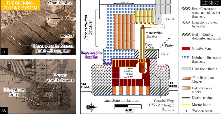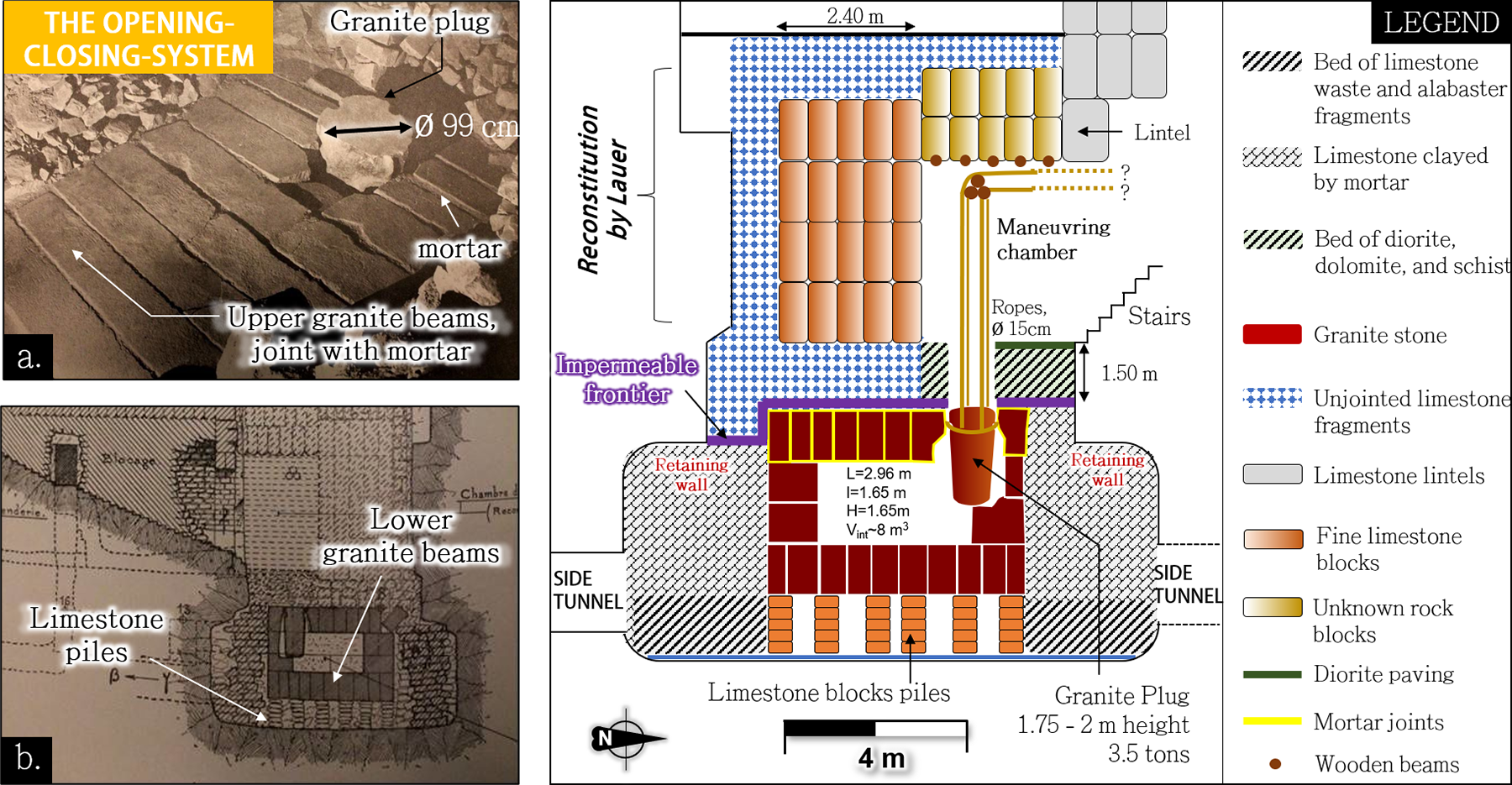 Внутренняя архитектура пирамиды Джосера также содержит указания на использование гидравлических технологий. Особый интерес представляют две шахты, расположенные к северу и югу от пирамиды. На дне каждой шахты находится массивная гранитная камера, а вверху — специальный механизм для открытия и закрытия отверстия в камере. Ученые выдвинули гипотезу, что эти шахты использовались для работы гидравлического лифта, который поднимал строительные материалы на вершину пирамиды.