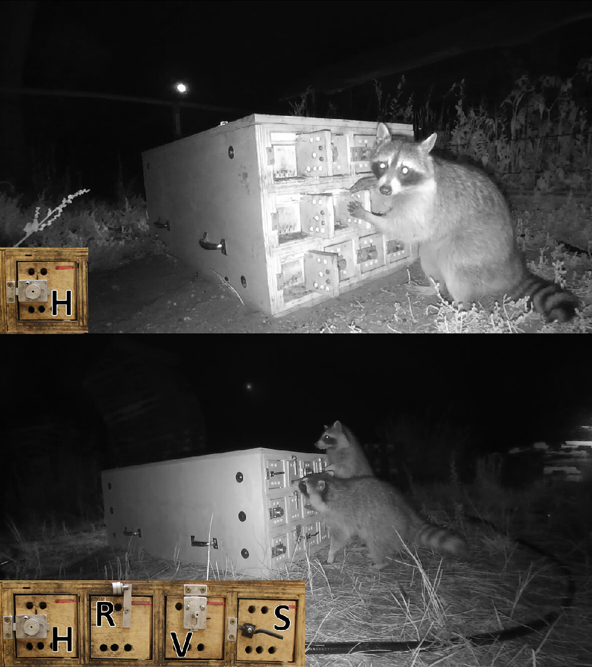 В фокусе исследования оказалась популяция енотов, обитающих в городе Ларами, штат Вайоминг. Ученые разработали два типа головоломок-коробок с лакомством внутри. Первая, с единственным типом замка, была призвана оценить базовый уровень инновационности енотов. Вторая, с четырьмя разными типами замков, позволила глубже изучить их поведенческую гибкость — способность переключаться между различными стратегиями решения задачи.
