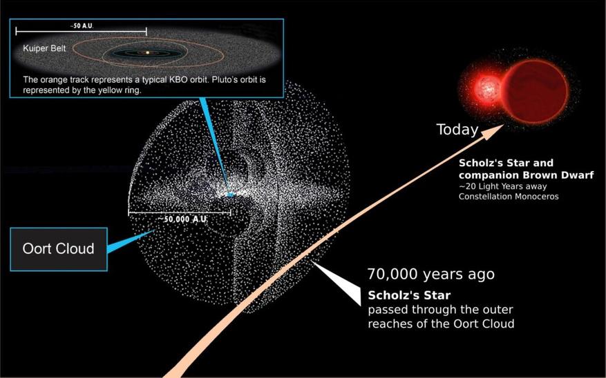 Учёные установили, что этот дуэт прошёл всего в 0,8 светового года от Солнца, то есть через внешние границы облака Оорта, где находятся миллиарды комет. Проход звезды мог нарушить их орбиты, отправив некоторые из них в сторону наших внутренних планет. Возможно, именно тогда часть комет, которые сегодня пересекают орбиту Земли, начала свой долгий путь по новой орбите.