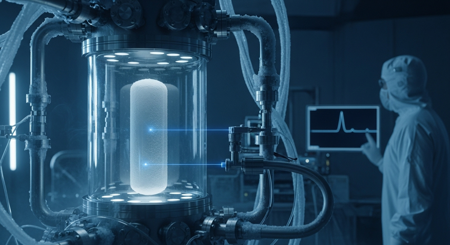 - Он охлаждается до температуры, близкой к абсолютному нулю. В таком состоянии из него уходит почти вся тепловая энергия, и слиток перестаёт «дрожать». Он замирает в своём минимально возможном энергетическом состоянии — «основном».