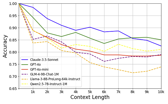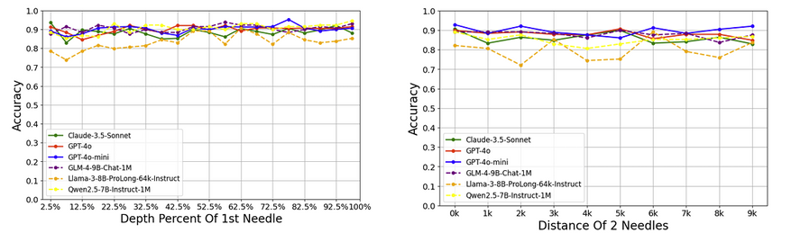 Казалось бы, чем больше контекста, тем лучше модель должна справляться, верно? Ведь у неё больше информации под рукой. А вот и нет! Выяснилось нечто парадоксальное: по мере увеличения объема «стога сена» точность ответов у многих моделей начинала… падать. Не сильно, но заметно. Особенно это коснулось моделей с открытым исходным кодом по сравнению с их коммерческими собратьями.