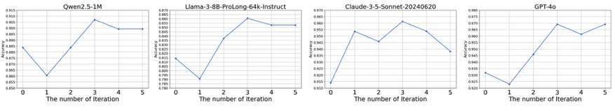 Следующий логичный шаг: а что если не просто заставлять модель думать итерациями во время теста, а прямо научить её этому? Взяли одну из моделей (Llama-3-8B-ProLong), которая показывала сильное падение точности, и дообучили её на примерах вот такого пошагового, итеративного мышления, сгенерированных с помощью мощной GPT-4o.