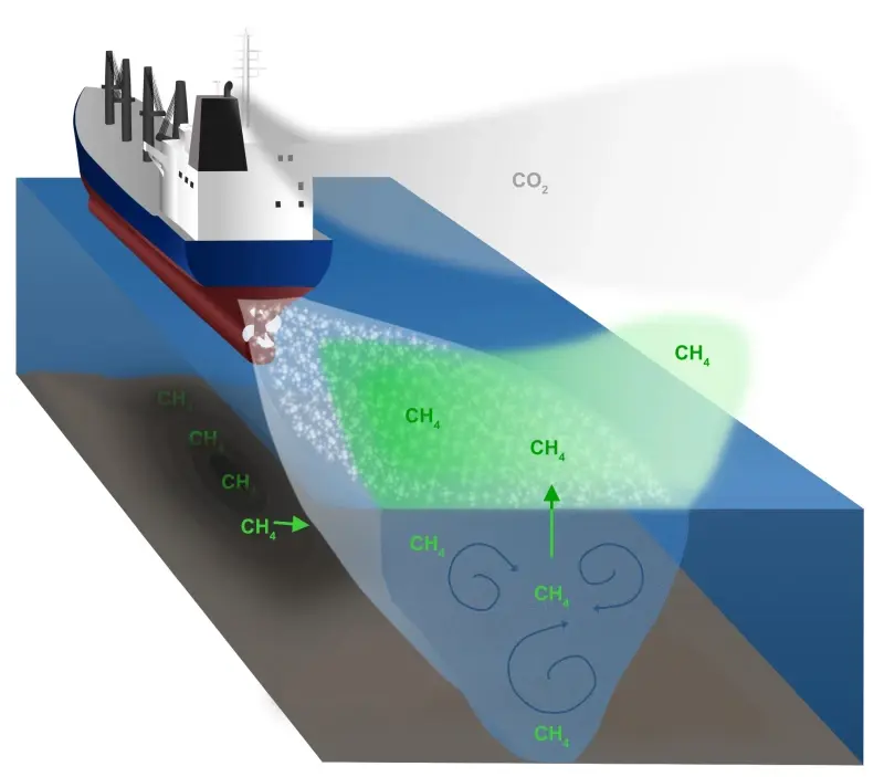 Механизм выброса метана связан с биогенными процессами в донных отложениях мелководных морских районов, богатых органическими веществами и лишённых кислорода. Когда суда проходят над такими участками, их движение вызывает перепады давления и турбулентное перемешивание водных масс. Это приводит к высвобождению растворённого метана сначала в воду, а затем в атмосферу.