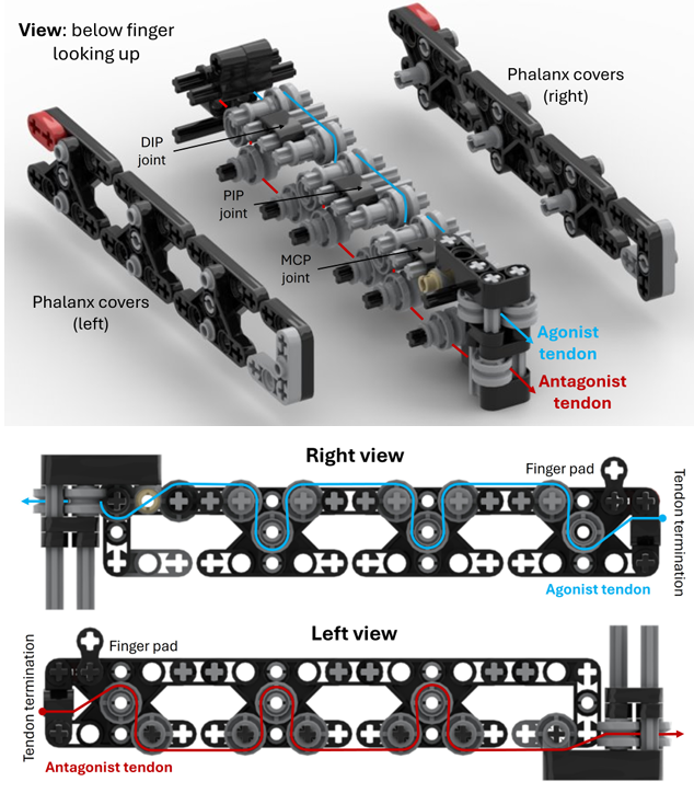 - Двойная система сухожилий. На каждый палец идут два «сухожилия». Первое, агонист, отвечает за сгибание. Второе, антагонист, — за активное разгибание. Такая схема гораздо эффективнее, чем пассивное разгибание с помощью пружин или резинок, так как обеспечивает точный контроль и лучшее усилие.