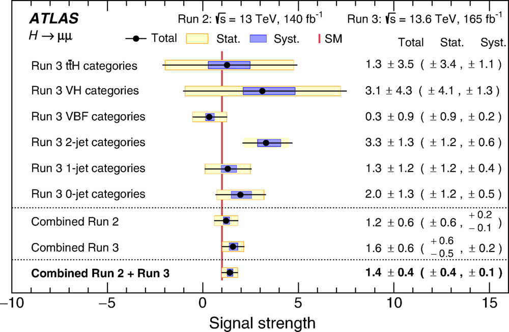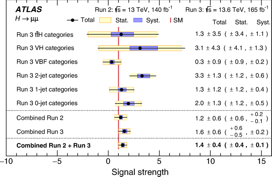 Параметр силы сигнала (μ), полученный ATLAS, равен 1,4 +- 0,4. Стандартная модель предсказывает ровно 1. Полученное число находится в пределах погрешности от единицы. Это означает, что наши текущие представления о материи верны. Поле Хиггса действительно дает массу частицам второго поколения, и делает это именно так, как предсказывали теоретики полвека назад.