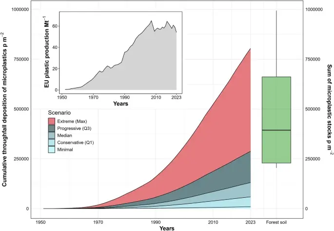 Более того, они построили математическую модель, чтобы оценить, сколько пластика могло попасть в эти леса из атмосферы начиная с 1950-х годов — эпохи начала массового производства пластмасс.