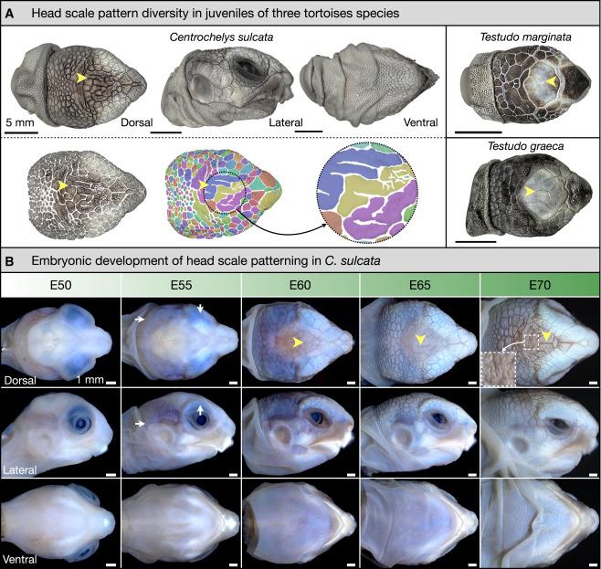 - Чешуйки по краям головы, на периферии, образуются по классическому «рецепту» — с помощью генетически запрограммированных плакод. Они более-менее симметричны и предсказуемы.