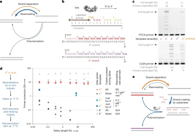 Сам процесс напоминает хорошо срежиссированный химический танец. Сначала РНК-фермент в форме двойной спирали смешивают с этими триплетами. Затем раствор подкисляют и нагревают до внушительных 80°C. Это как следует «встряхивает» двойную спираль, заставляя её разойтись на отдельные нити. В этот момент триплеты получают шанс «прилипнуть» к нужным местам на этих нитях, формируя своего рода «перекладины» будущей новой спирали.