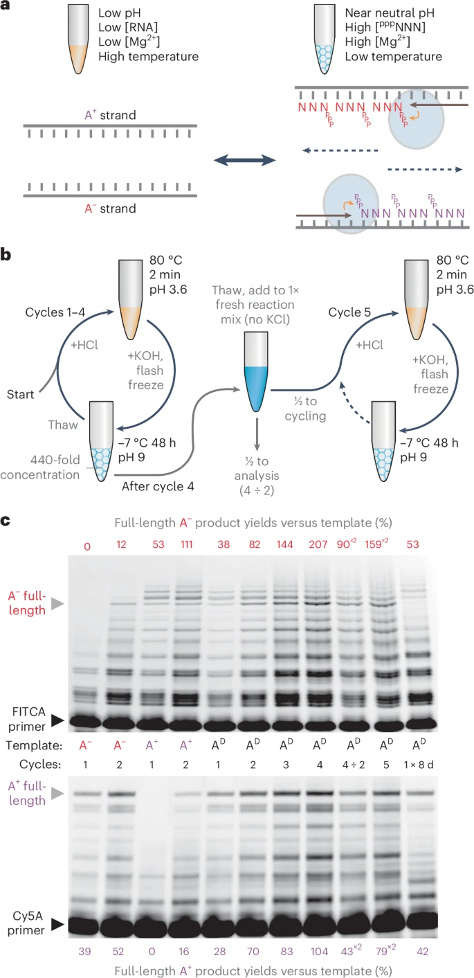 Дальше — резкая смена декораций. Раствор делают щелочным и стремительно охлаждают до -7°C. Вода начинает замерзать, а оставшаяся незамерзшая жидкость становится очень концентрированной. Именно в таких условиях РНК-фермент «просыпается» и начинает свою работу: он сшивает прилипшие триплеты в единую новую цепь.