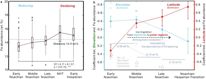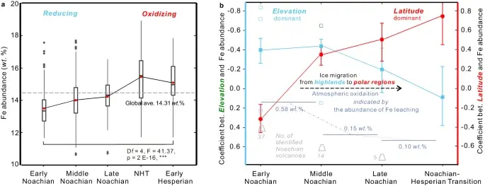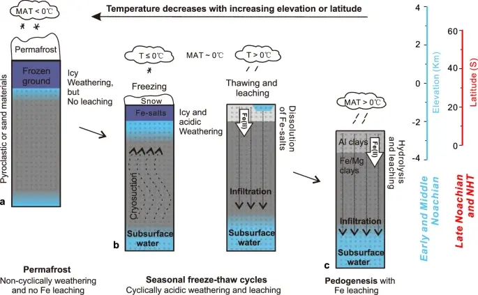 Одной из причин такого изменения мог быть процесс выщелачивания железа из почвы под воздействием воды и низких температур. В восстановительной атмосфере раннего Марса вода, обогащенная железом, могла свободно перемещаться по поверхности, формируя реки и озера. Однако по мере окисления атмосферы и снижения температуры вода начала замерзать, а выщелачивание железа замедлялось. Этот процесс, вкупе с ослаблением парникового эффекта, привел к глобальному похолоданию и образованию ледяных шапок на полюсах.