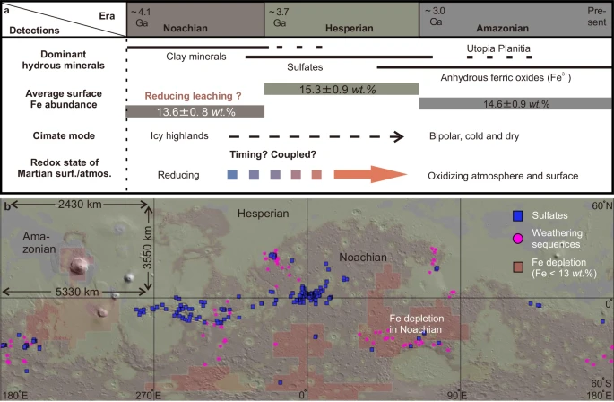Свидетельства этой драматической трансформации были обнаружены с помощью гамма-спектрометра, установленного на борту орбитального аппарата Mars Odyssey. Анализируя данные о распределении железа на поверхности Марса, ученые заметили любопытную закономерность. В древних областях, относящихся к нойской эре (4,1 — 3,7 млрд лет назад), содержание железа снижалось с высотой, а в более поздних — с широтой. Это указывает на то, что климат Марса постепенно менялся, переходя от режима, определяемого высотой, к режиму, определяемому широтой.