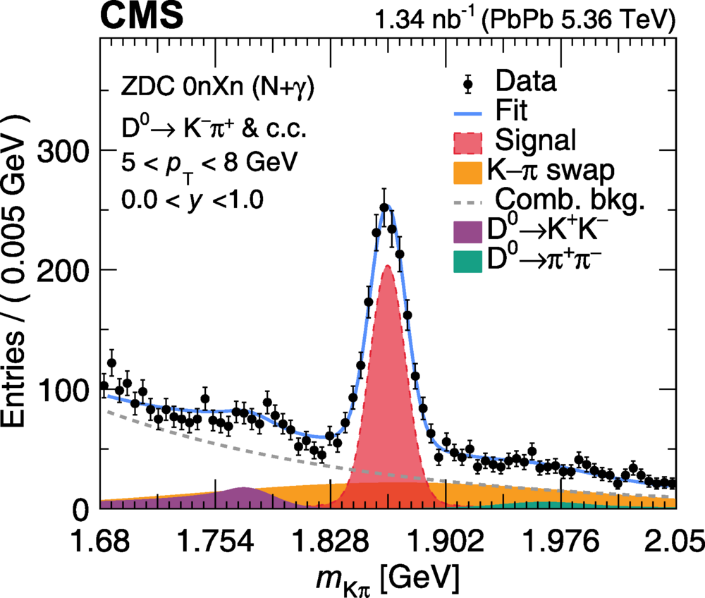 Вылетая за пределы ядра, очарованный кварк мгновенно захватывает из вакуума другие легкие кварки (этот процесс называется адронизацией) и формирует составную частицу — D0-мезон. Именно эту частицу и продукты ее дальнейшего распада фиксируют многослойные детекторы установки CMS.
