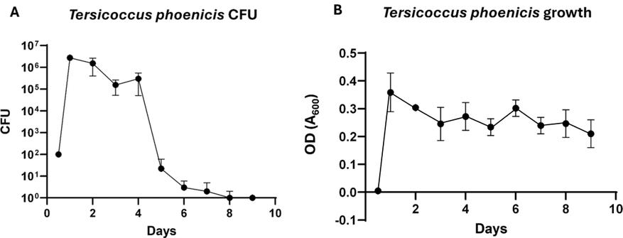 Выяснили это опытным путем. Ученые поместили T. phoenicis в среду с малым количеством еды, и измеряли два показателя. Первый — число колоний (КОЕ) — это подсчет живых бактерий, которые выросли на питательной поверхности. Второй — оптическую плотность, которая показывает общую массу всех клеток.