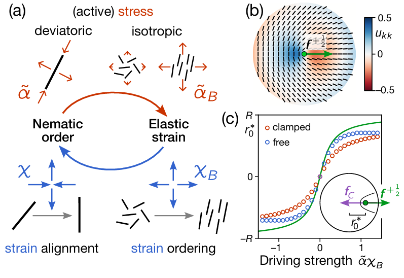 Второй механизм работает через выравнивание деформаций. В этом случае учитывается, что активное напряжение может создавать сдвиговые деформации в материале. Из-за асимметрии дефекта +1/2 эти сдвиговые силы имеют разные знаки в передней и задней частях искажения. Волокна стремятся выстроиться вдоль оси сдвига, что создает разницу энергий между полюсами дефекта и формирует постоянную толкающую силу, заставляющую структурное нарушение двигаться вперед.