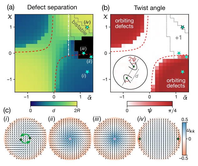 При высоких значениях активного напряжения движущая сила заставляет дефекты +1/2 преодолеть взаимное отталкивание и сместиться точно в центр ограниченной области. Там они принудительно сливаются, формируя единый дефект с зарядом +1. Геометрически он выглядит как расходящиеся лучи звезды или концентрический водоворот. До появления этой работы в физике жидких кристаллов считалось, что дефект +1 крайне нестабилен и может существовать только в том случае, если размер ограничивающей области сопоставим с размером самого геометрического искажения (на уровне нескольких нанометров). Новые расчеты доказывают, что активная среда способна самостоятельно удерживать стабильность дефекта +1 даже на макроскопических масштабах за счет накопленного внутреннего напряжения ткани.