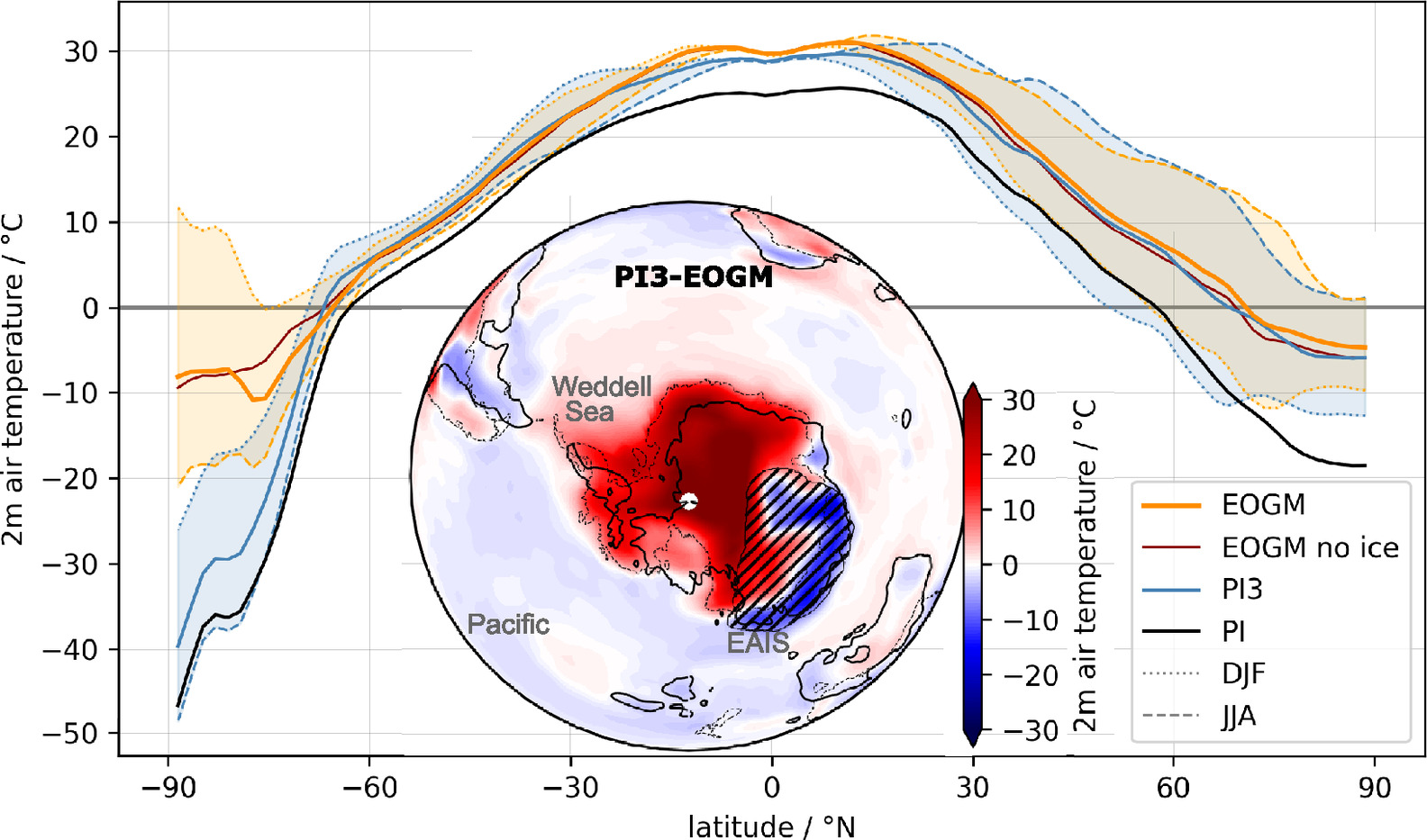 В результате Антарктида не была изолирована от остального мира. Круговое течение не замкнулось, и океан продолжал активно обмениваться температурными массами. В Южном океане того времени доминировали обширные региональные водовороты. Самым значительным из них был расширенный круговорот моря Уэдделла. Восточная ветвь этого течения постоянно направляла прогретые поверхностные воды непосредственно к побережью Восточной Антарктиды.