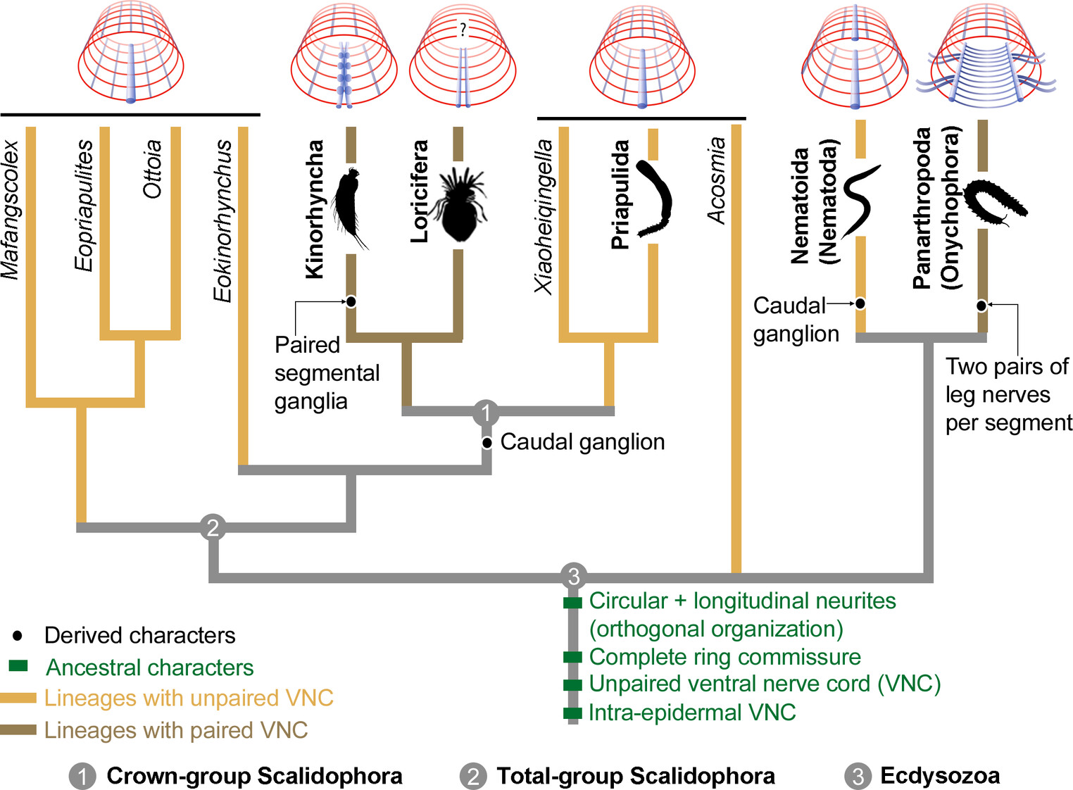 Ключевым объектом исследования стала так называемая вентральная нервная цепочка — своего рода «спинной мозг» многих беспозвоночных. Но вот вопрос: у одних эта цепочка одинарная, как струна, а у других — парная, словно две нити, сплетенные вместе. Какая из этих конструкций была изначальной? Ответить на этот вопрос помогли древние Scalidophora — группа, включающая приапулид, лорицифер и киноринхов.