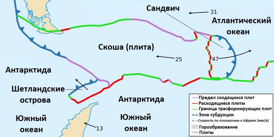 - Дуга Скоша: расположена между Южной Америкой и Антарктидой. Здесь тихоокеанская плита погружается под литосферу Атлантики, продвигаясь на восток.