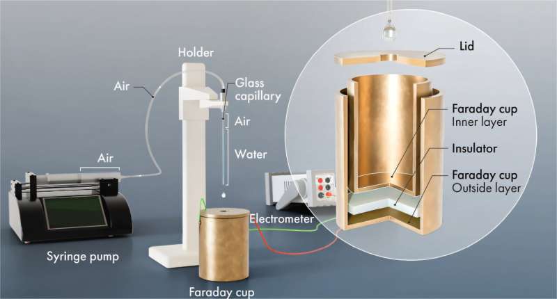 Аспирант Иньфэн Сюй из лаборатории Химаншу Мишры провел серию экспериментов с капиллярными трубками. Воду втягивали в гидрофобную капиллярную трубку, после чего выпускали капли в чашку Фарадея — медный сосуд с электрометром, который фиксировал электрический заряд капель. Исследователи применяли стеклянные капилляры с разными химическими покрытиями.
