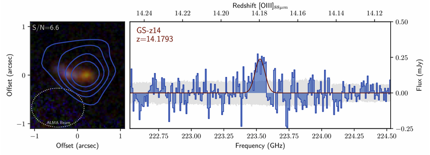 Первоначально, благодаря JWST, была обнаружена сама галактика GS-z14. Но чтобы подтвердить её удалённость и изучить её свойства, потребовались наблюдения ALMA. Учёные сфокусировали антенны ALMA на GS-z14 и, к своему удивлению, чётко зафиксировали линию [OIII]88µm. Это стало не только подтверждением рекордно высокой удалённости галактики, но и открыло новые возможности для её изучения.