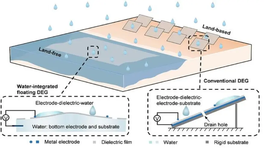 Группа исследователей из Нанкинского университета аэронавтики и астронавтики (NUAA) представила плавающий генератор, способный преобразовывать энергию падающих дождевых капель в электричество. Устройство, получившее название W-DEG (Water-based Droplet Electricity Generator), работает на поверхности водоёмов и использует воду одновременно как конструктивную основу и проводящий электрод.