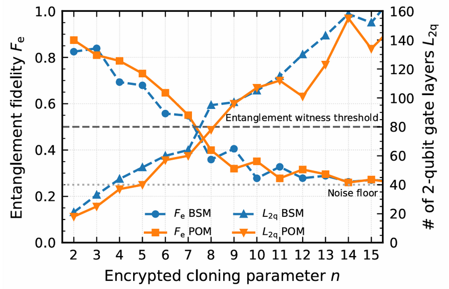 В первом эксперименте ученые проверяли базовую чувствительность метода к аппаратному шуму. Они создавали до 15 зашифрованных клонов одного кубита. Чтобы доказать, что квантовая информация не повреждается, оригинальный кубит предварительно запутывали со сторонним кубитом-анциллой. После расшифровки одного из клонов физики измеряли степень сохранения этой запутанности. Результаты показали, что падение точности происходит плавно и обусловлено исключительно естественным накоплением ошибок в логических вентилях процессора по мере роста глубины схемы. Само по себе распределение информации по множеству клонов не приводит к серьезному разрушению данных.